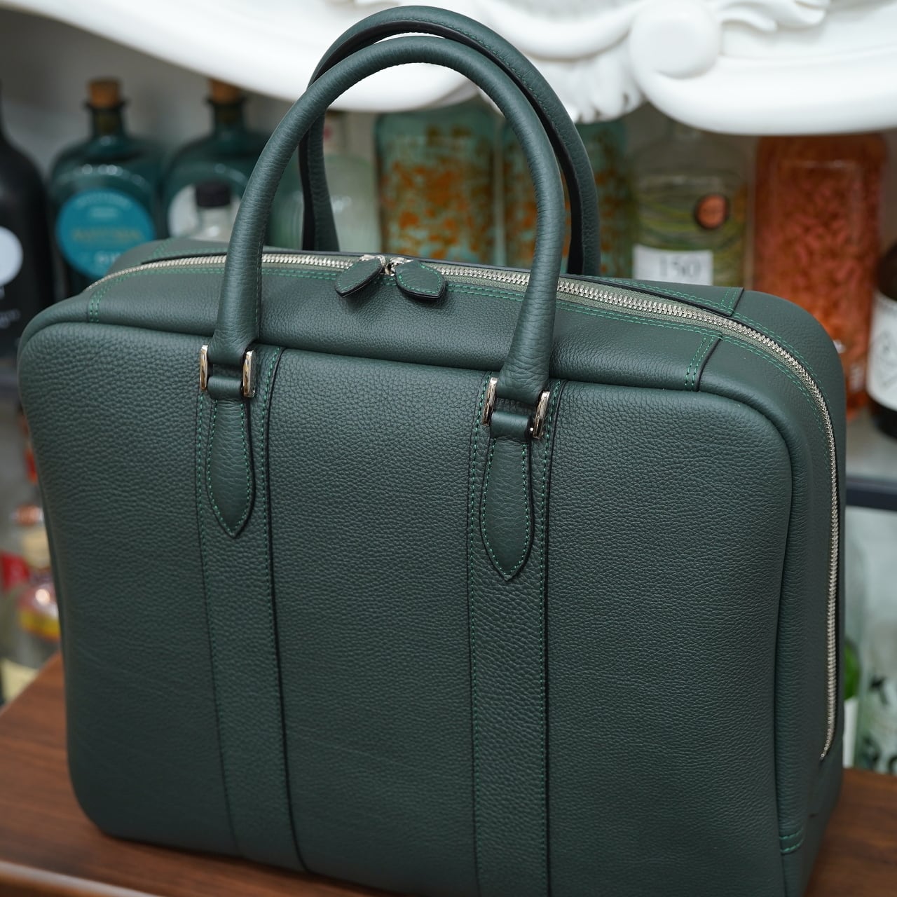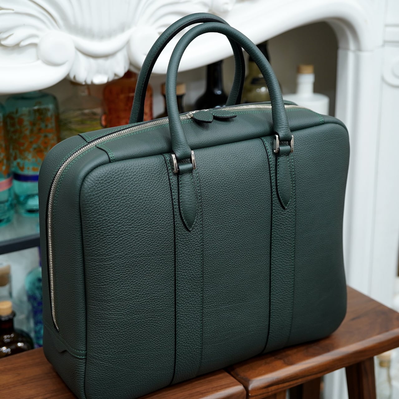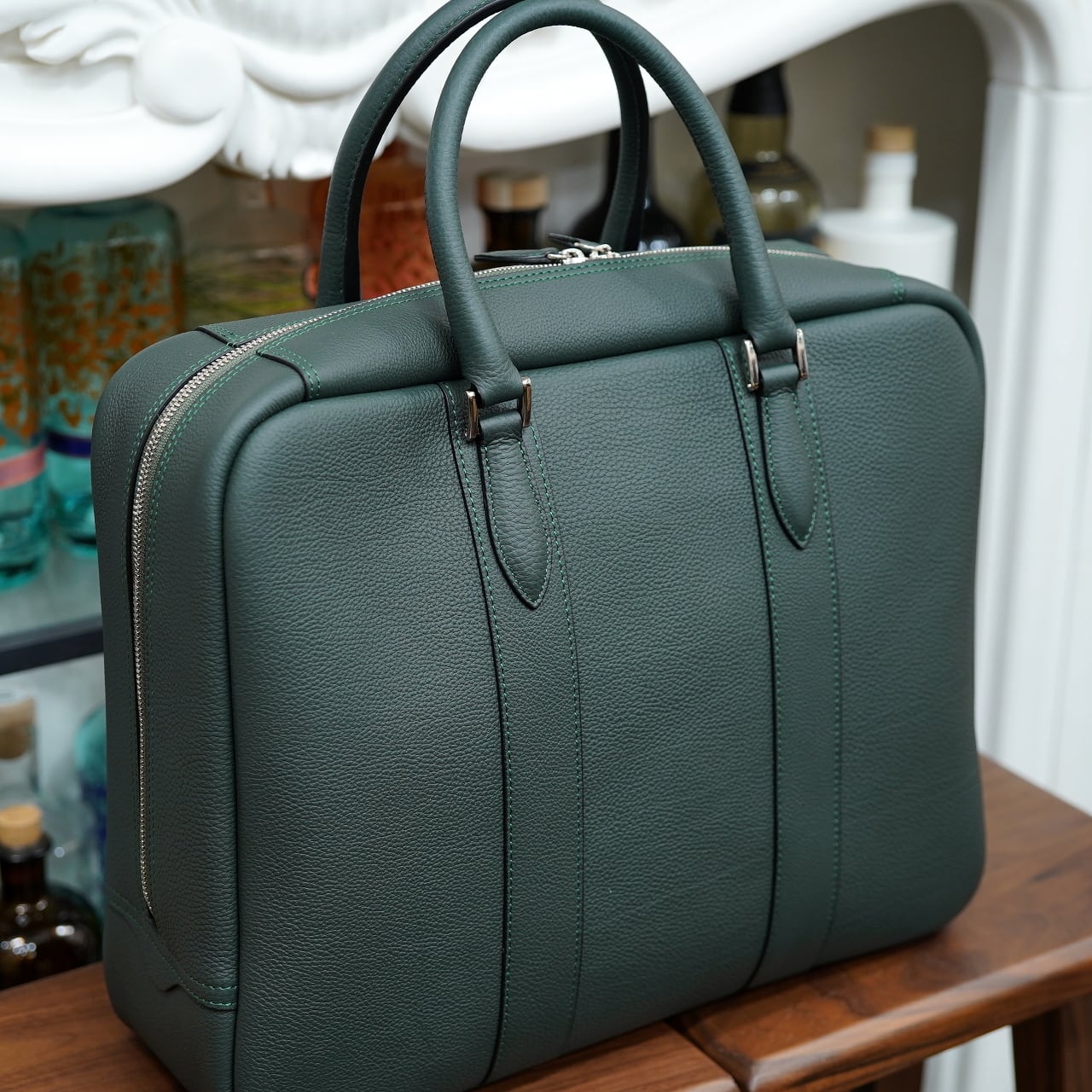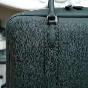 ふっくらと美しく作られたブリーフケースであるコンフェ・ヴは外装にドイツはペリンガー社のシュランケンカーフを贅沢に用いて、内装は総ピッグスエード仕上げとラグジュアリーさも溢れた、見栄えと実用性を兼ね備えたファスナー式ブリーフケースです。