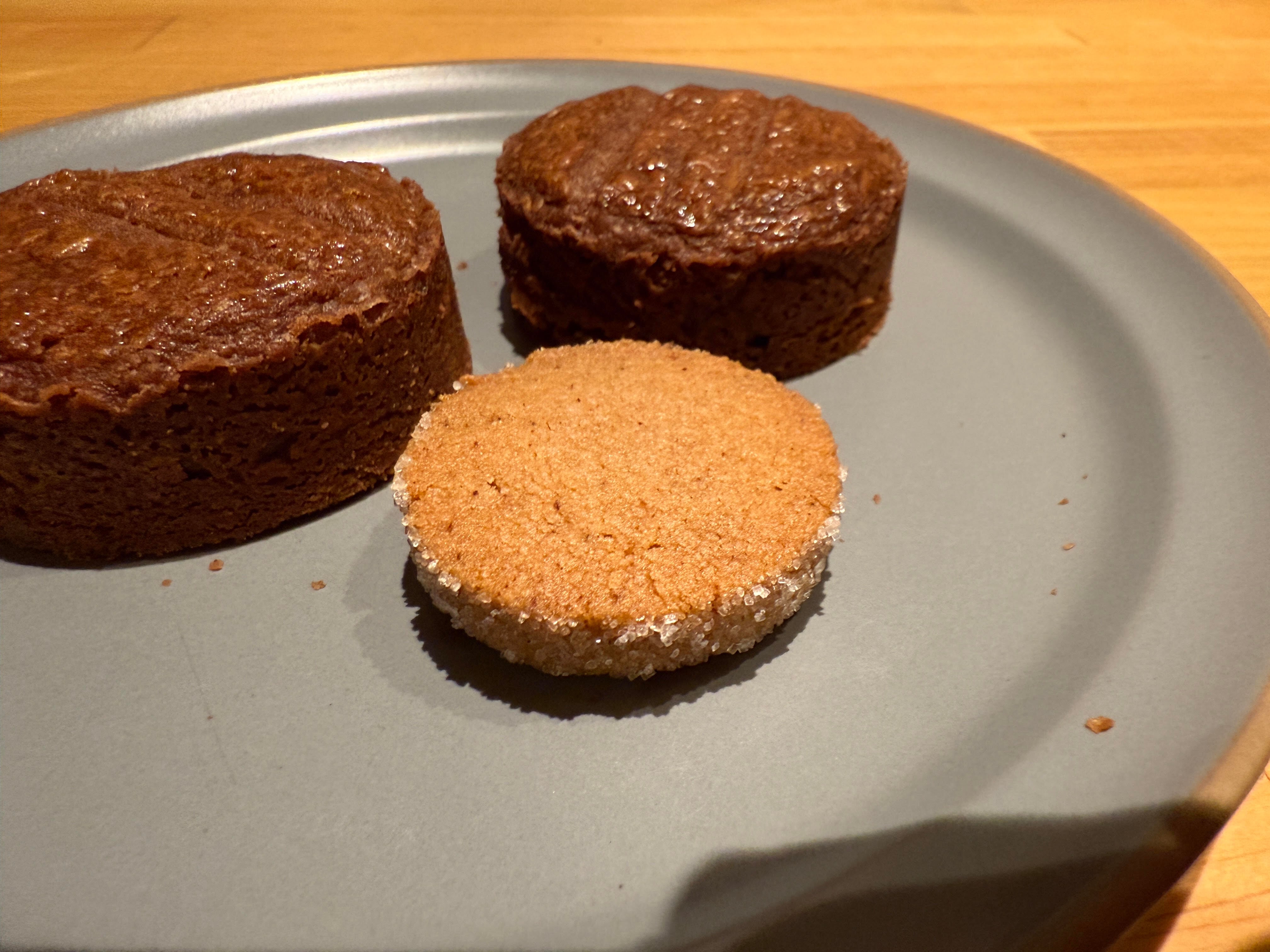 ・チョコレートガレットブルトンヌ:発酵バターの良い風合いとコク、適度な甘さが心地よくリッチな質感の少し厚みのある丸い焼き菓子です。そこにものすごく贅沢にたっぷり良いチョコを加えることで、温かみのあるコク深い味わいともはやデザート的なリッチ感が味わえます。