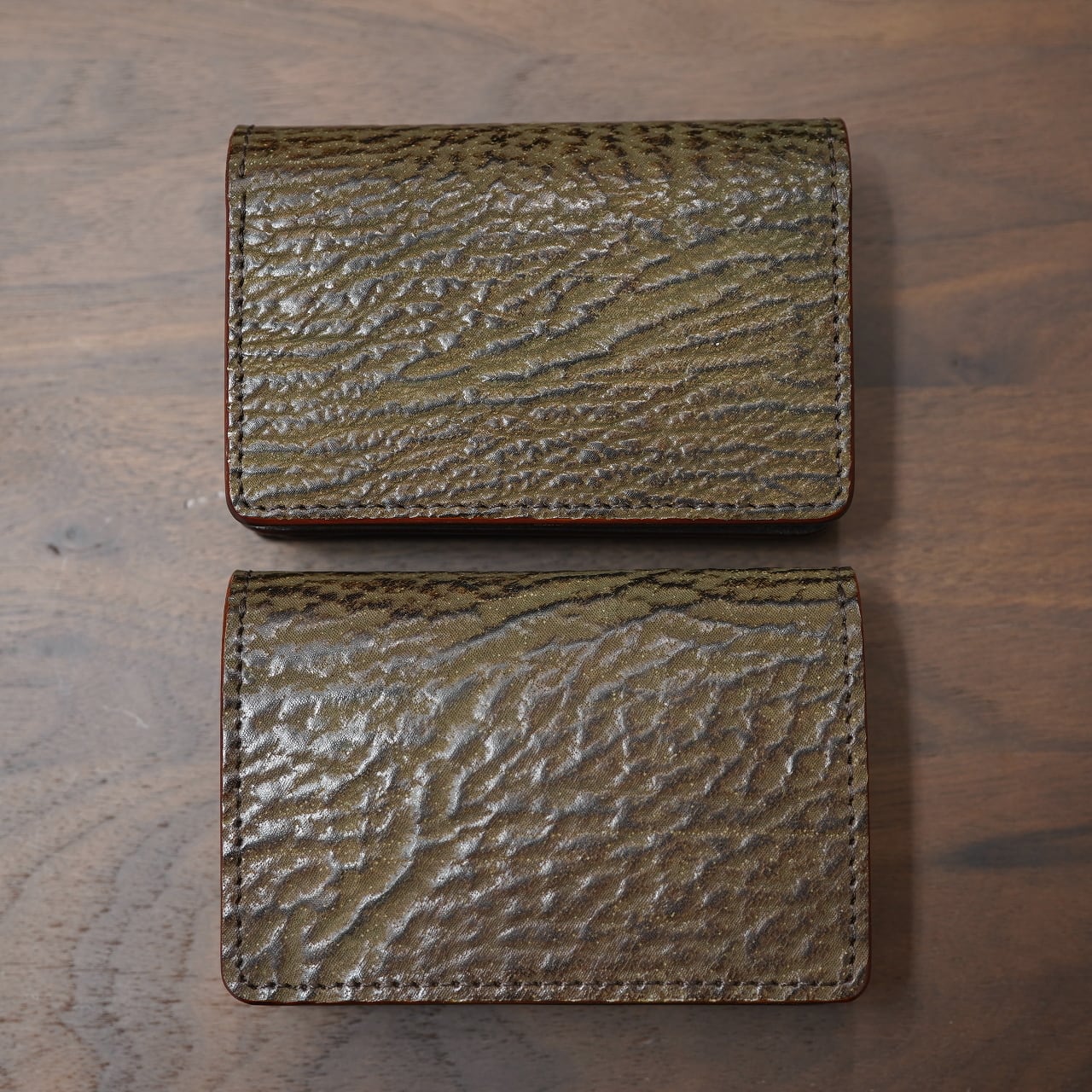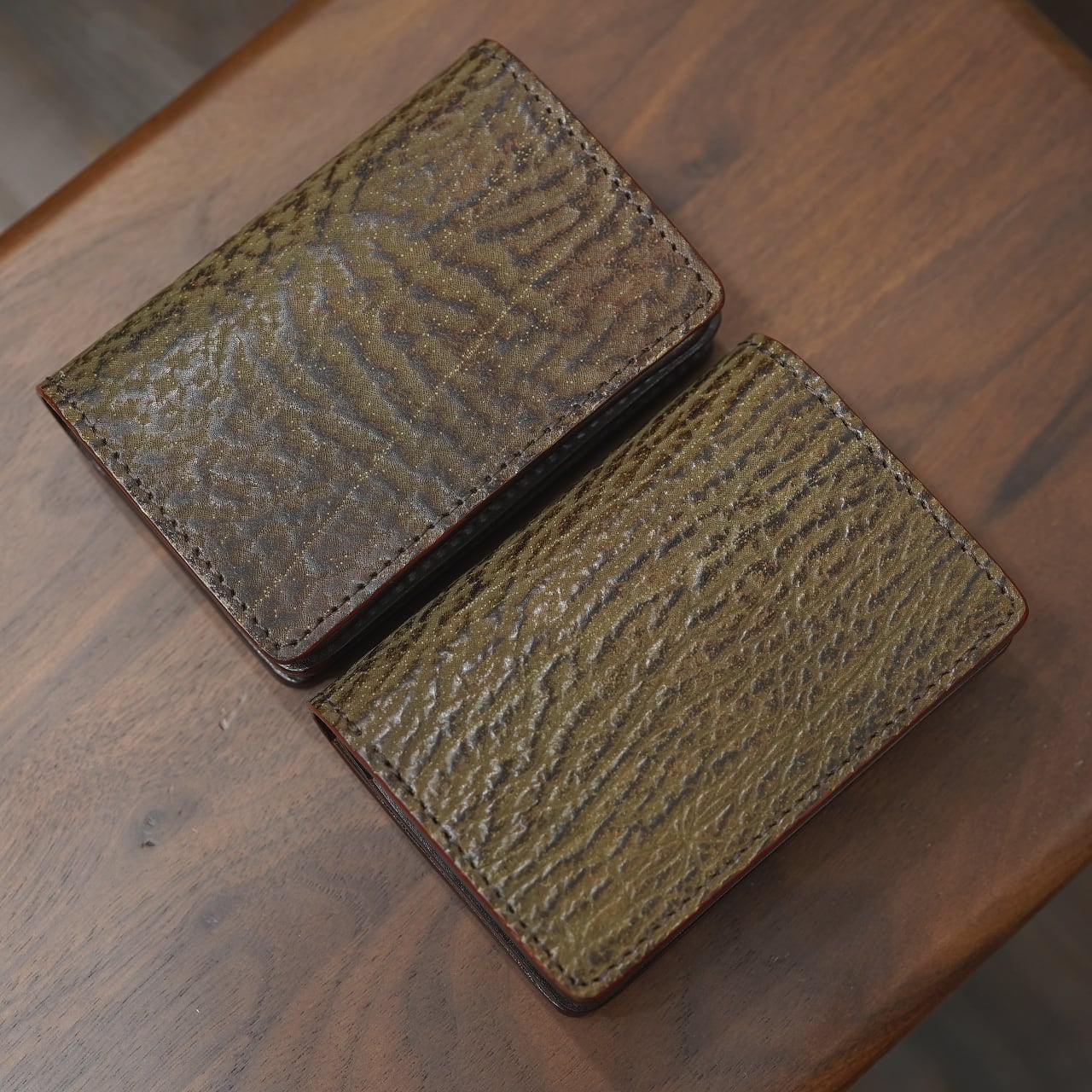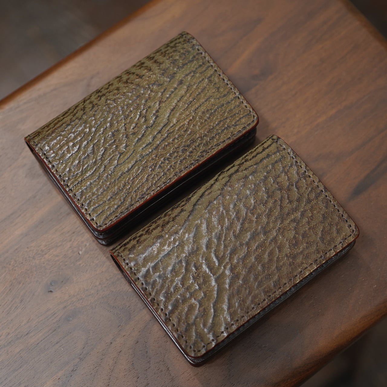 メインボディにはシャークレザーの中でもちょっと珍しいイタチザメ革を贅沢に用いており、他であまり見かけない独特な革の表情と、個性的な発色感が面白い仕上がり。