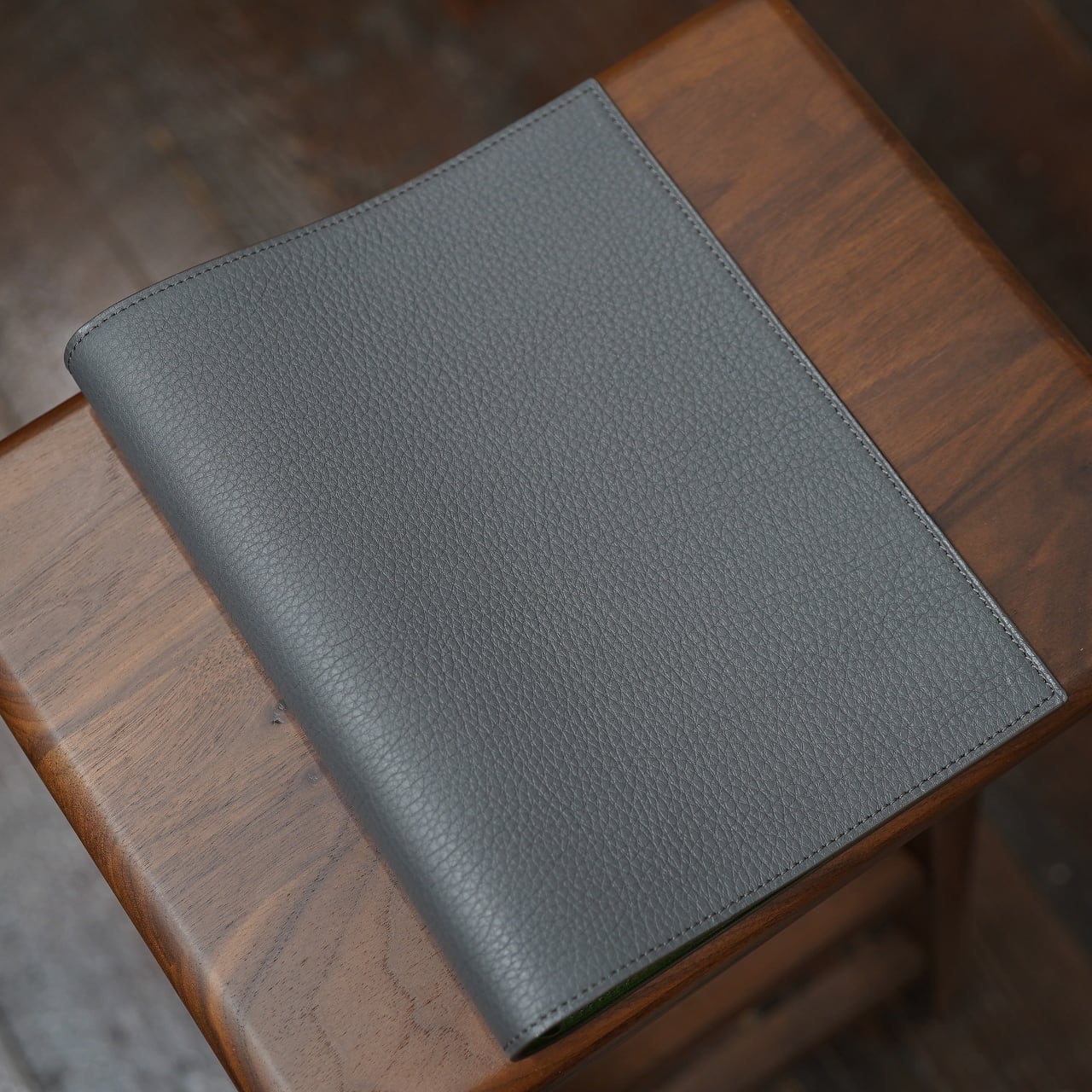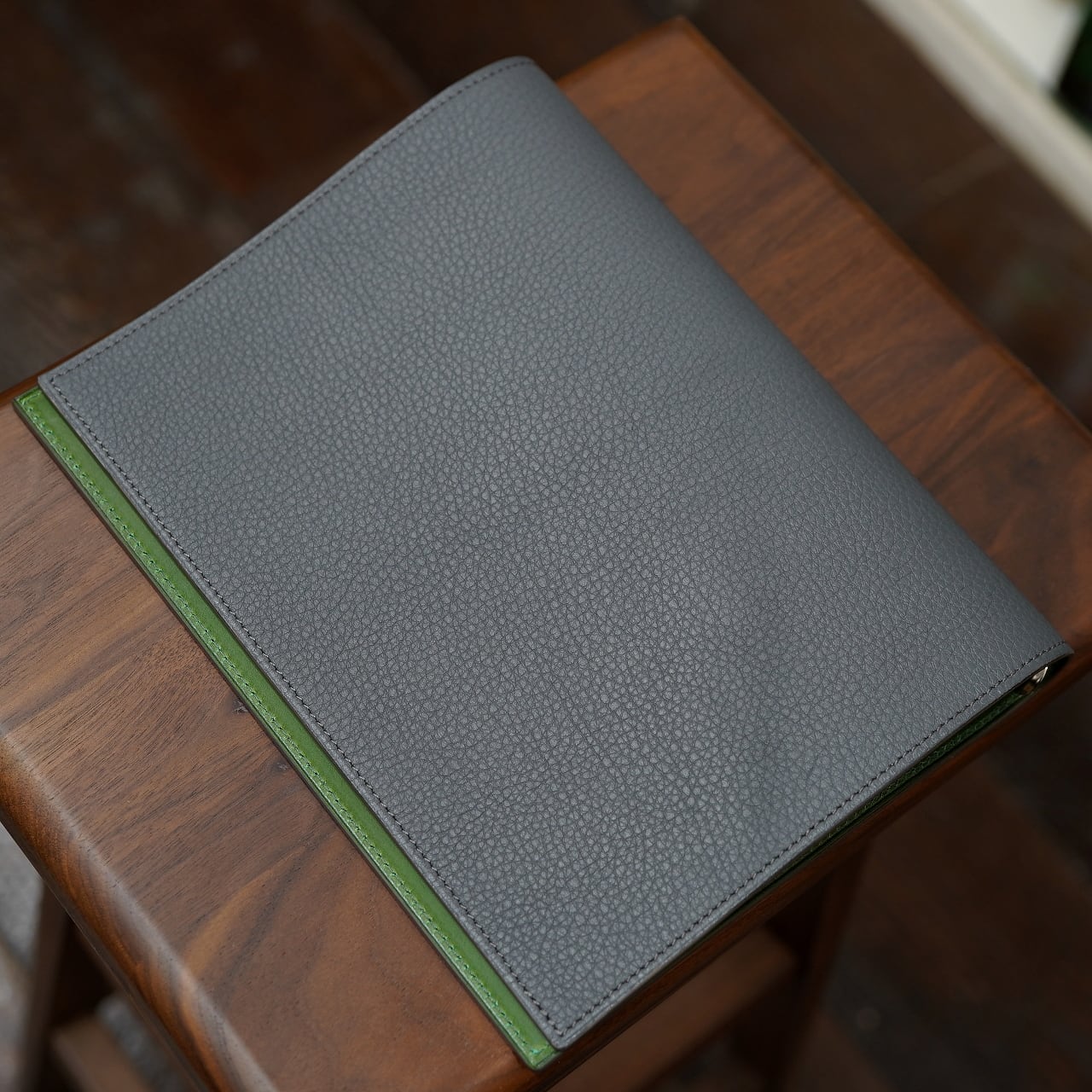 今回おもてにはドイツはペリンガー社のシュランケンカーフを中心に、少し特殊な皮革を用いたりもしてもらいました。こちらはフランスはデュプイ社のトゴ、グレーを用いました。
