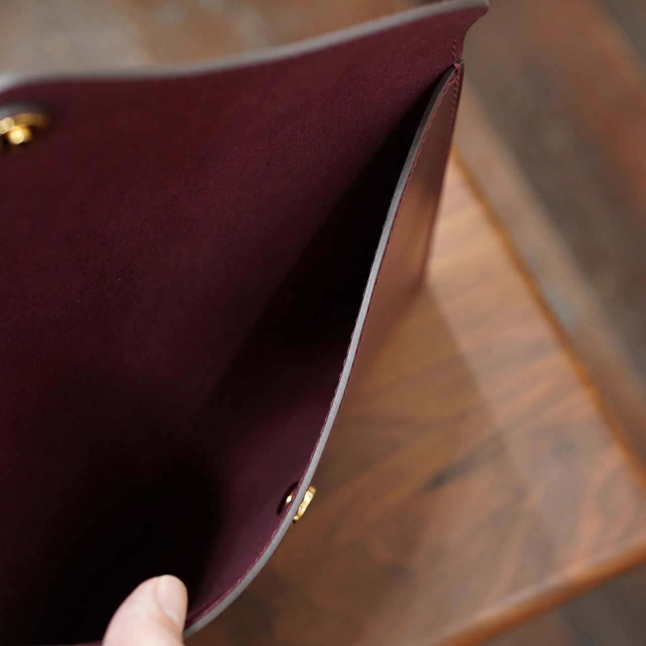 内装には手触り極めて良いマイクロファイバースウェードを。表の色合いや質感に合わせて、内装の色もそれぞれで変えてつけてくれています。