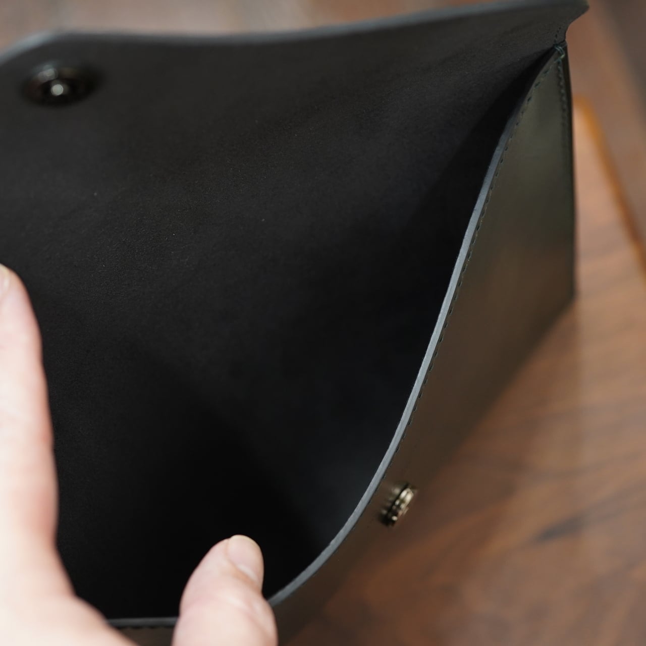 マチなしのクラッチに見えつつも、ボディ部分はふっくり膨らむようなパターンに、また底面部分にはステッチを入れないことでゆとりをもった自然なマチ感があるように楽しめます。