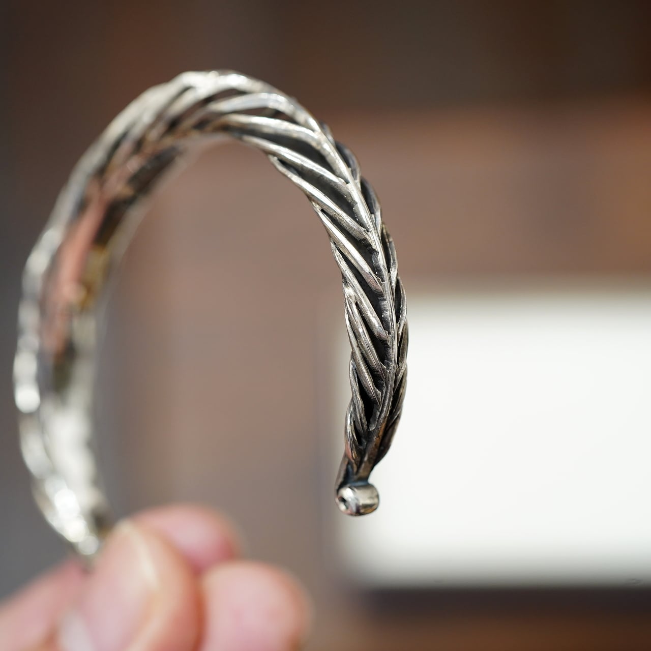 きめ細やかにスタイリッシュな雰囲気と、立体的かつ力強さのある空気が同居し、美しくフェザーの質感が漂うシルバーのバングルは、男女問わず腕周りのアクセントとして楽しんでいただけます。