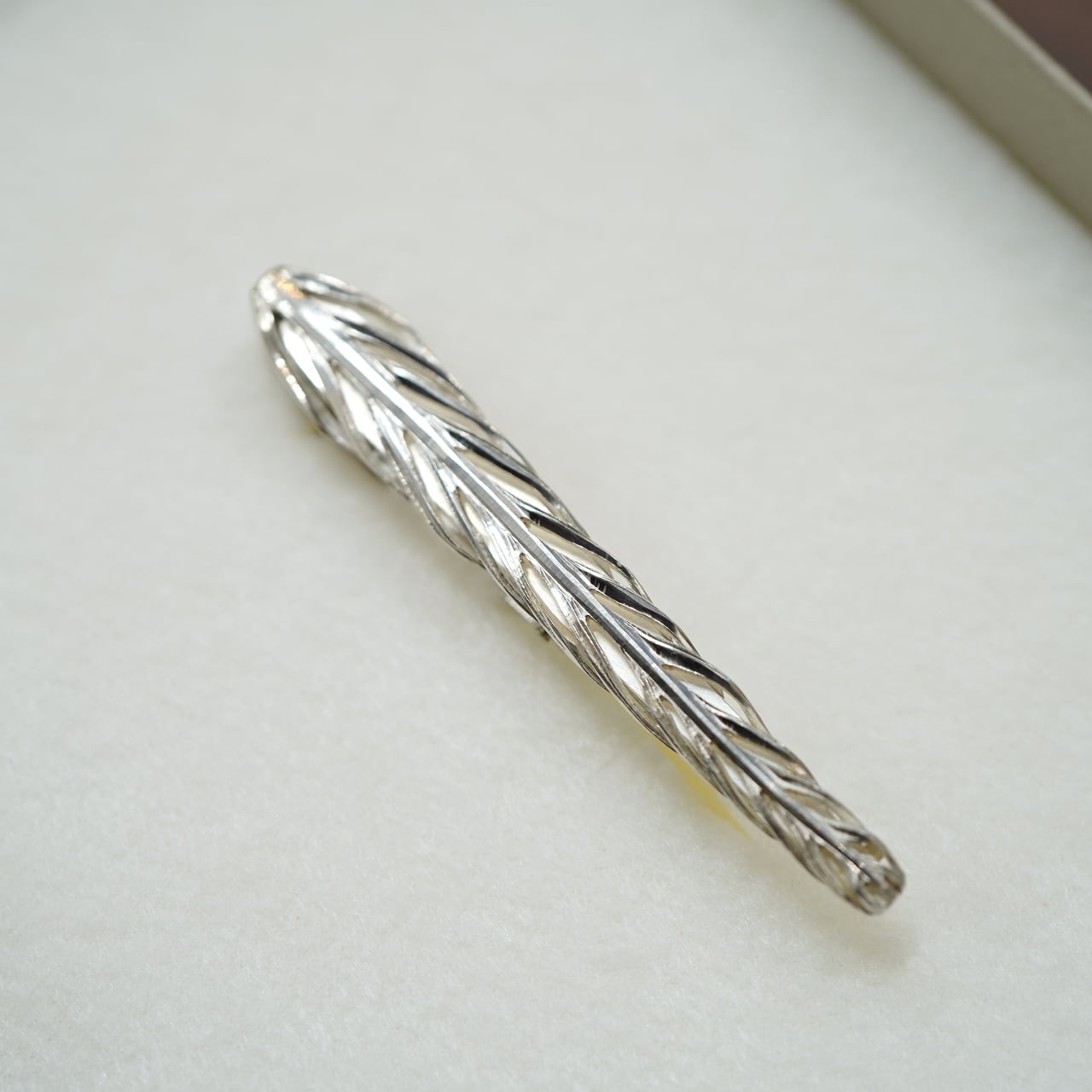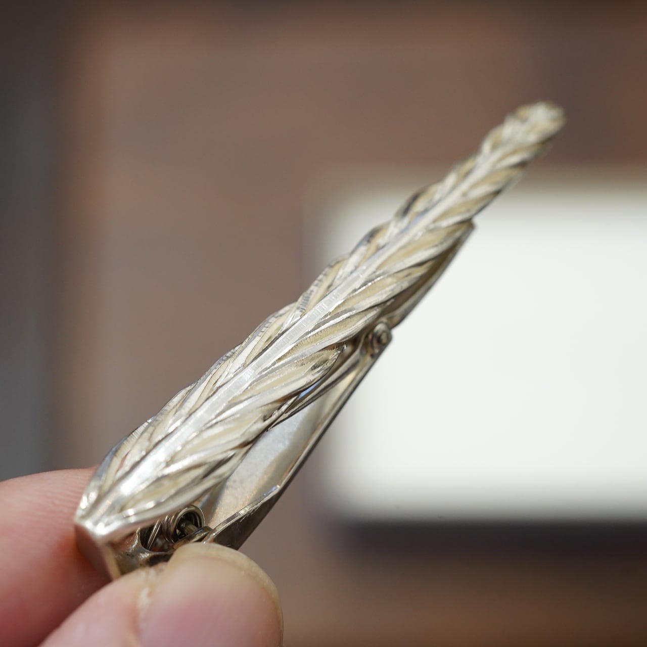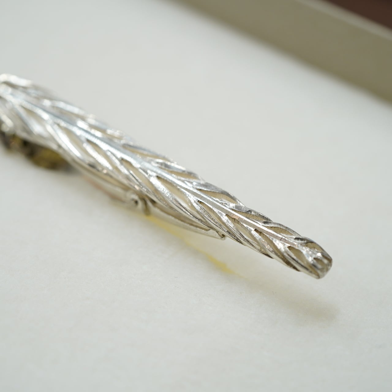 彫金作家である秋濱氏による、伝統的な金工技術を用いて、驚くほどに繊細なアクセサリーを製作するブランド、akihamaのシルバー950を贅沢にたっぷり用いて、特別な立体感溢れる仕様にしたボーンフェザータイクリップです。