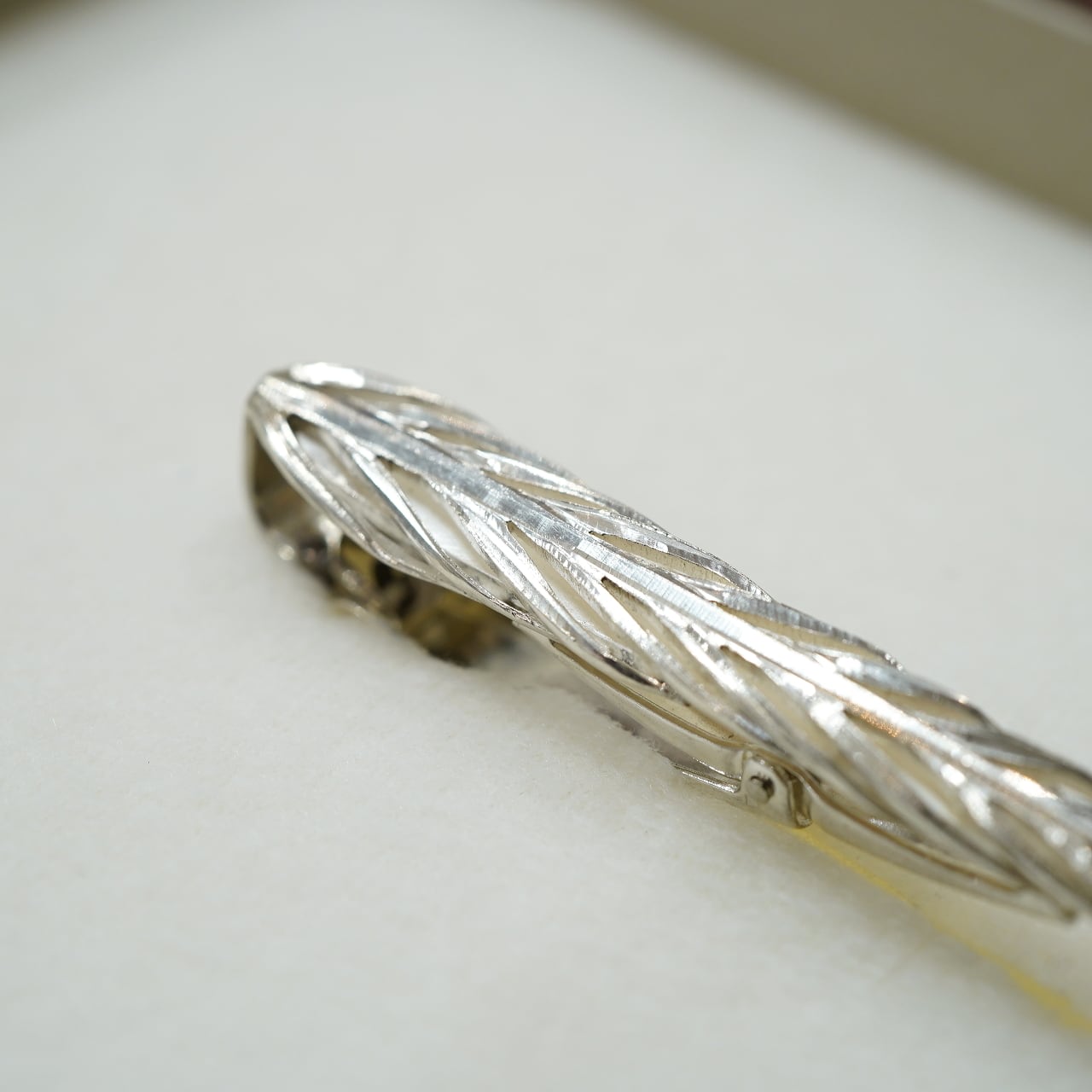 きめ細やかにスタイリッシュな雰囲気と、立体的かつ力強さのある空気が同居し、美しくフェザーの質感が漂うシルバーのタイクリップは、ネクタイをしっかりまとめるだけでなく、優雅なアクセントとして楽しんでいただけます。