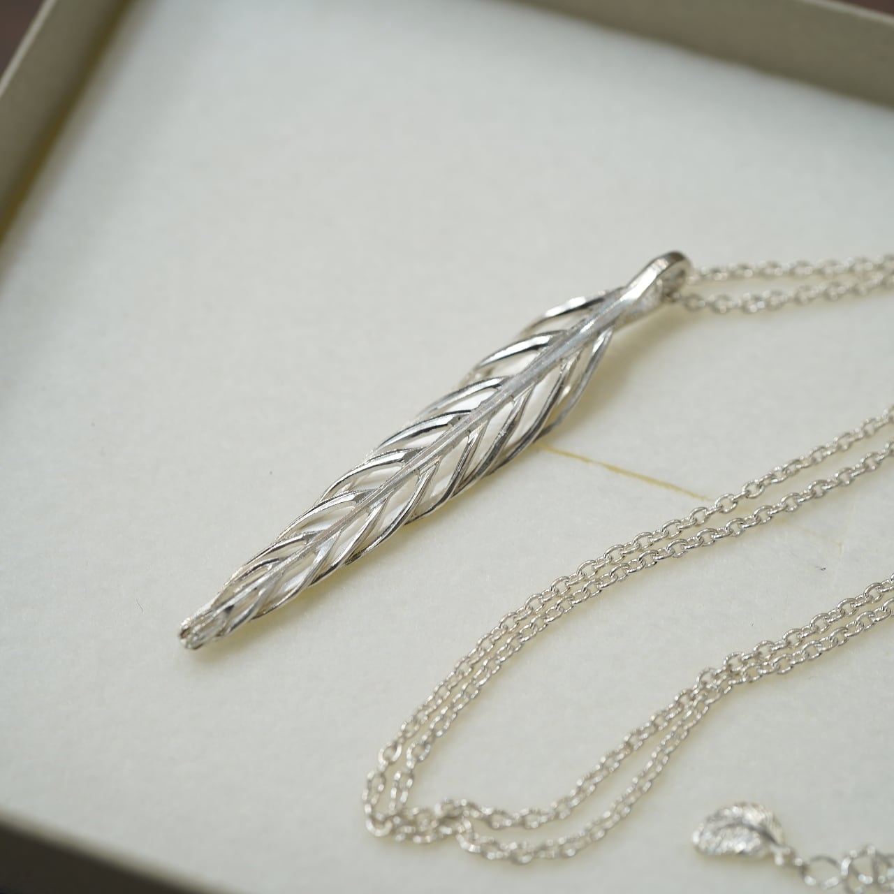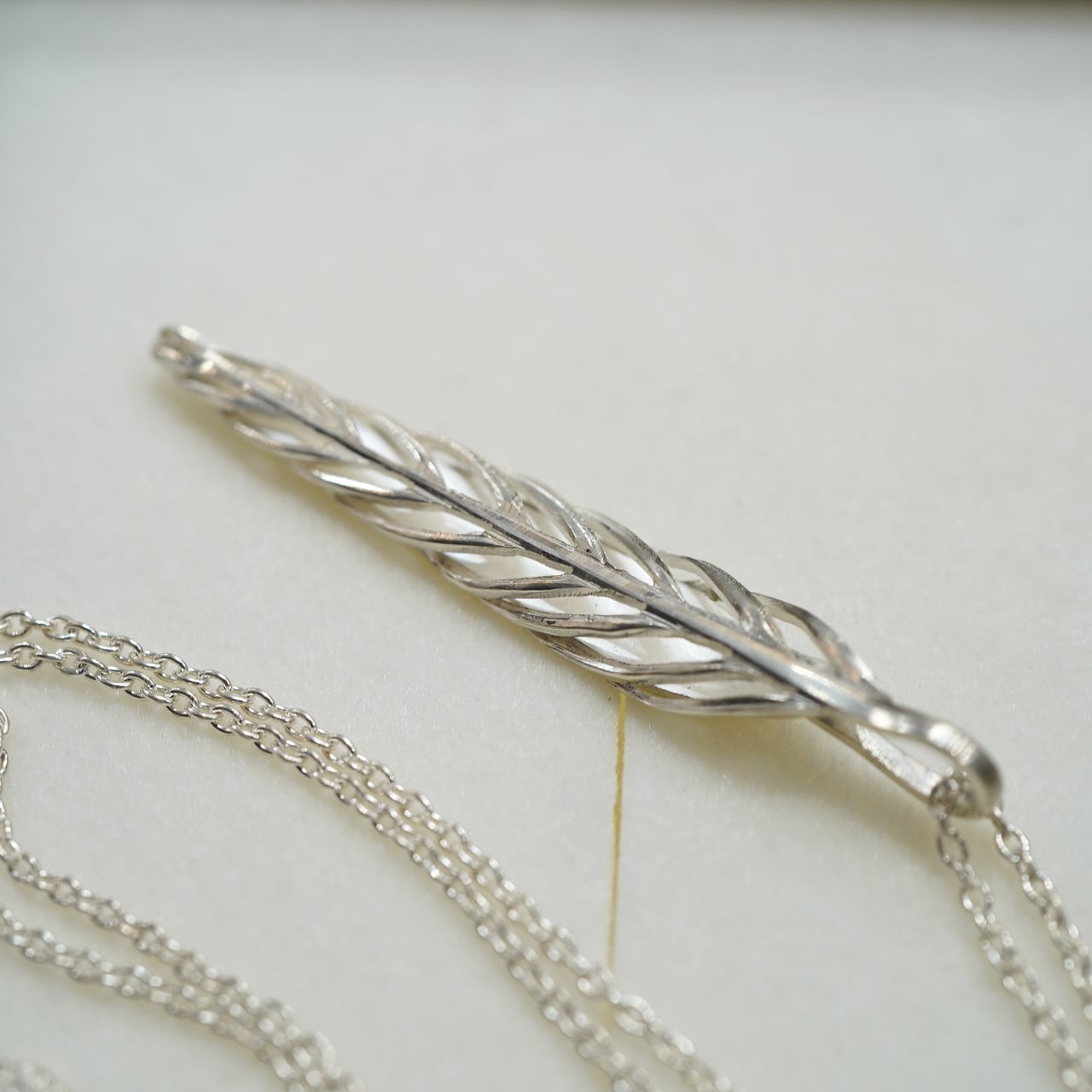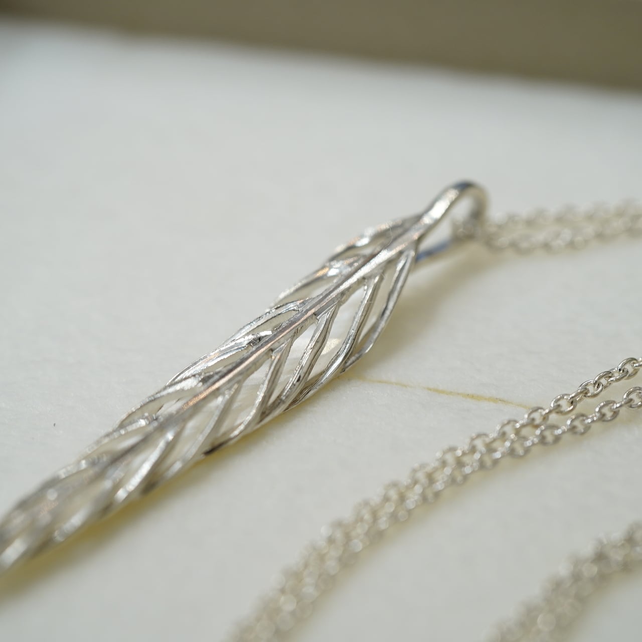 彫金作家である秋濱氏による、伝統的な金工技術を用いて、驚くほどに繊細なアクセサリーを製作するブランド、akihamaのシルバー950を贅沢にたっぷり用いて、特別な立体感溢れる仕様にしたボーンフェザーネックレスです。
