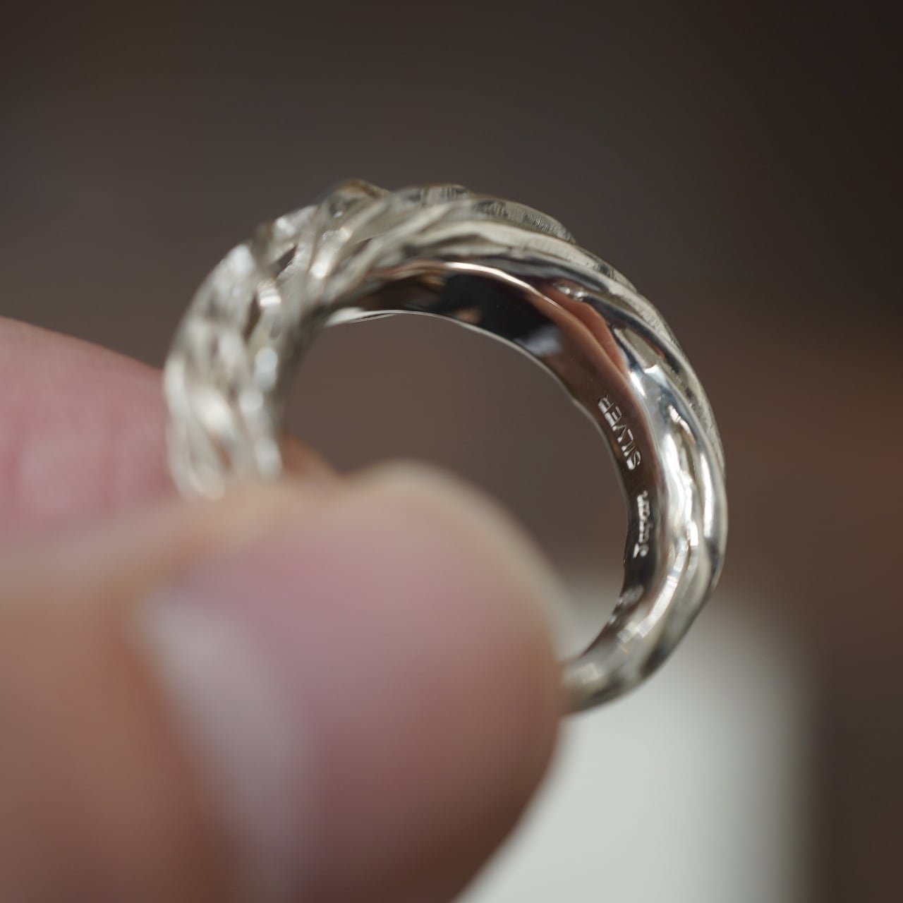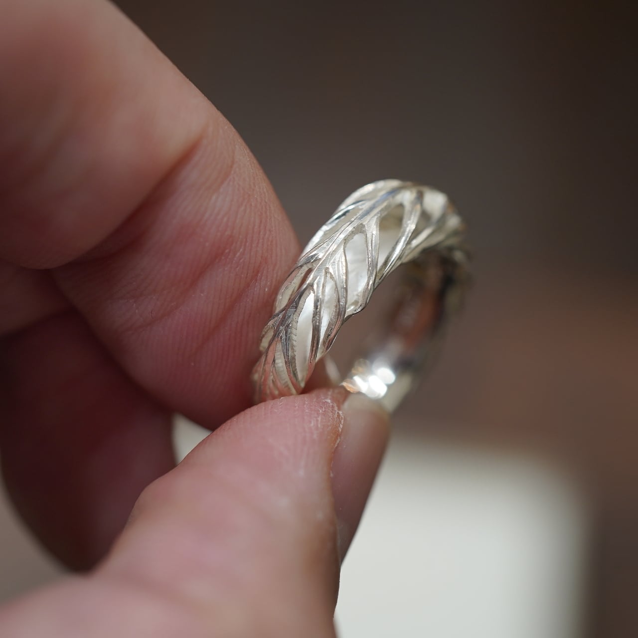 きめ細やかにスタイリッシュな雰囲気と、立体的かつ力強さのある空気が同居し、美しくフェザーの質感が漂うシルバーのリングは、ほどよいボリューム感がありつつ、非常に軽快に優雅に指を彩ります。