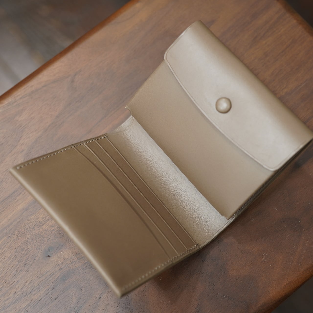 こちらはカンダミサコブランドの作る、シンプルでありつつカンダミサコらしい工夫と作りの美しさが備わった、小銭入れ付き二つ折り財布です。