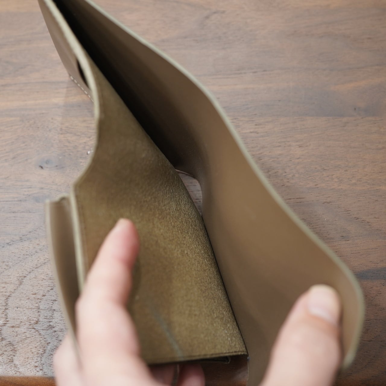 初めは革のハリがあるのでボディ全体がふっくらとして、やや開く感じがありますが、使っているうちにすぐに全体の革は馴染み、ペタンと自然と閉じ、薄く感じるようになります。