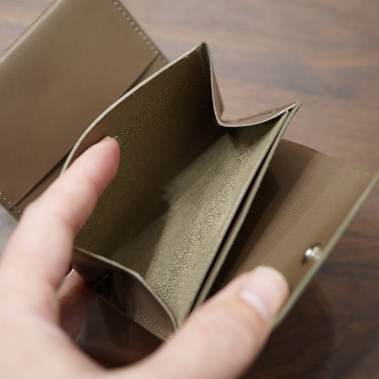 大量生産ではあまり見られない、一つ一つじっくり作るからこそ、の小銭入れ付き二つ折り。