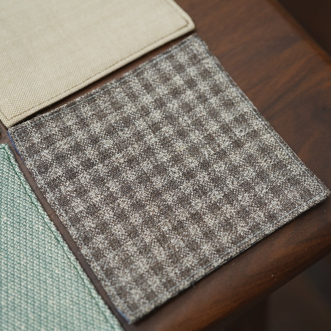 CIRCLE店主のハギレコレクションから、縫製担当の作り手のセンスに任せて色や柄、素材は組み合わせてもらって、自由につくってもらうコースター。