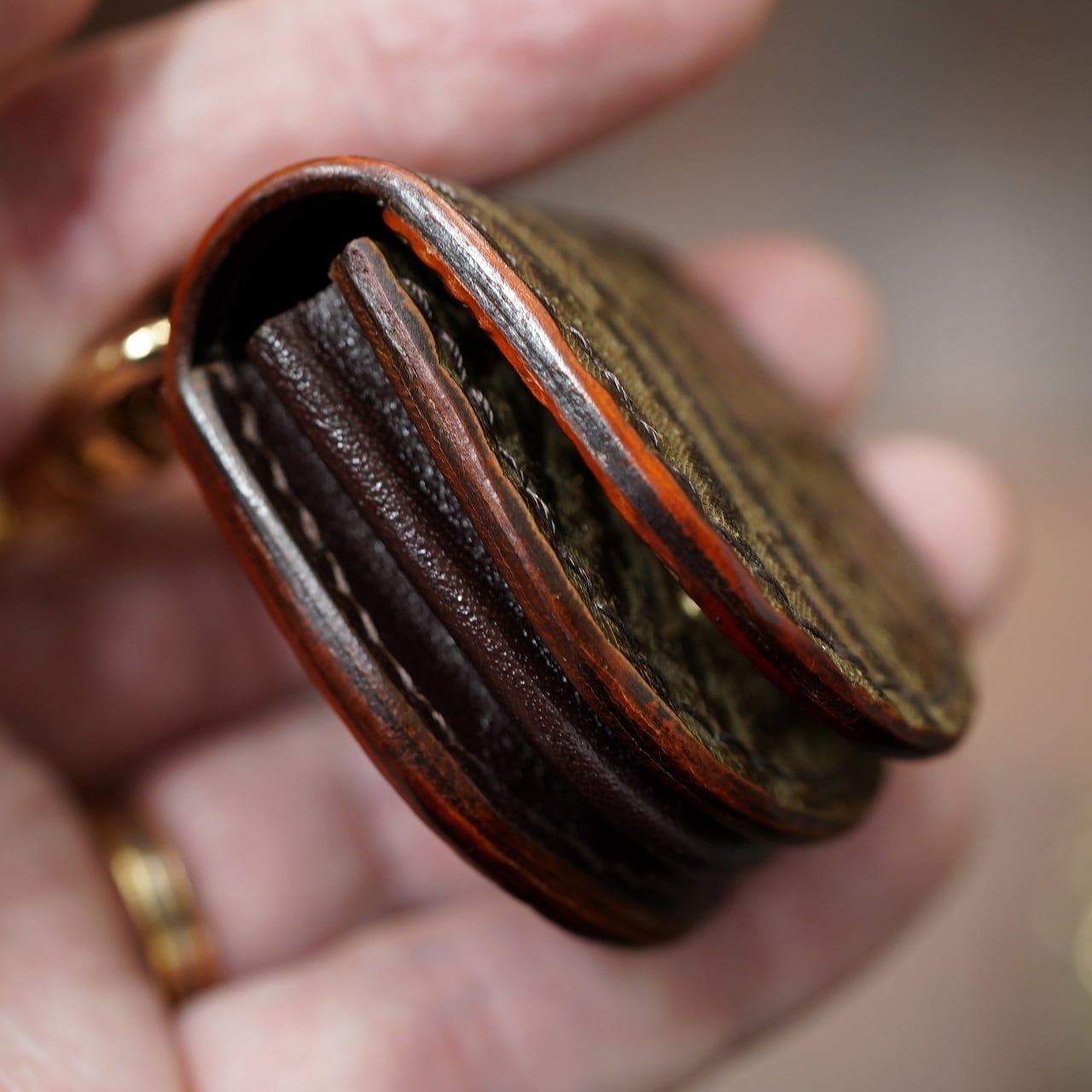 シンプルでありながら、しっかり革の豊かな風合いと、コンパクトながらしっかり良い収納力や楽しい機能性を持ったケースに仕上がっています。