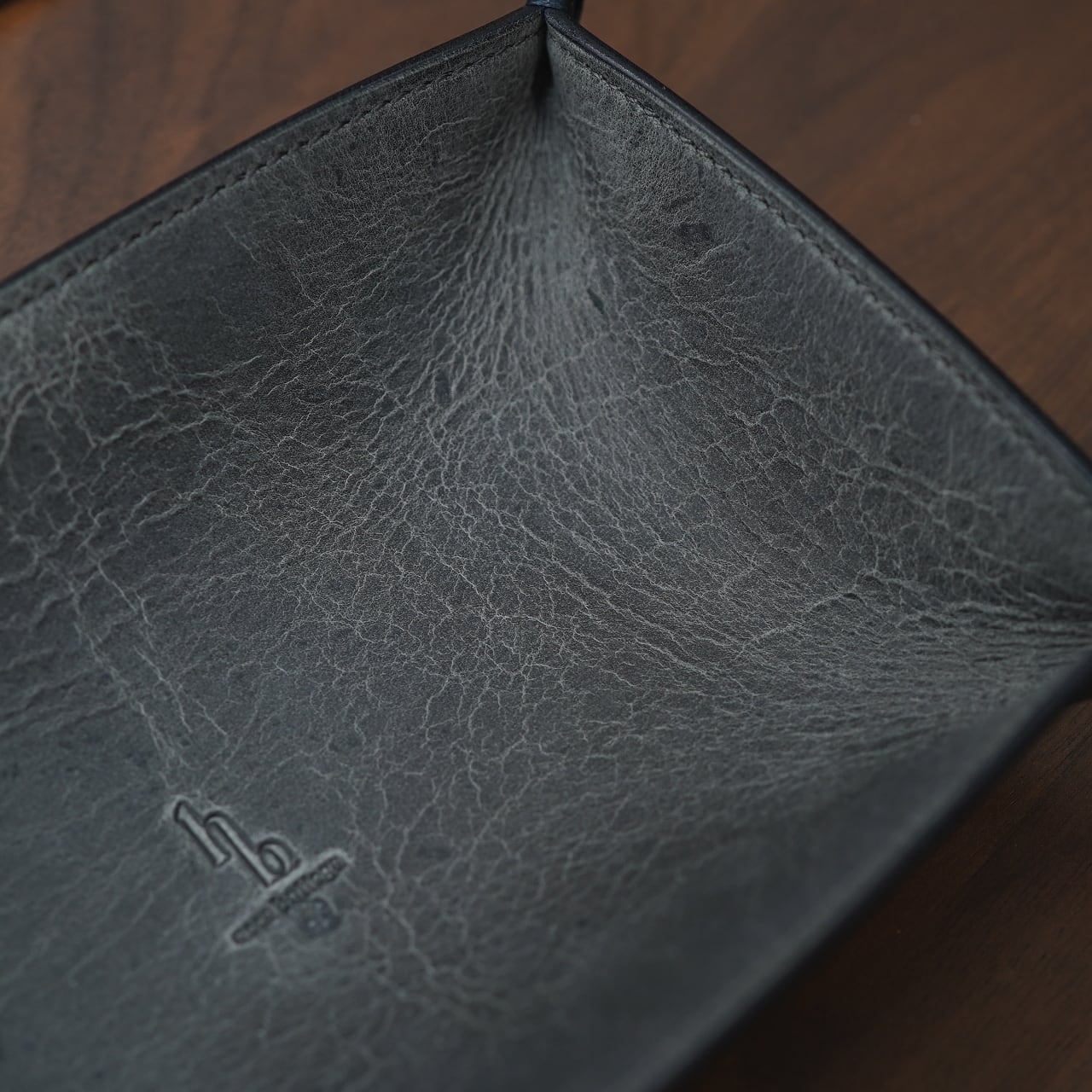 トレーの収納部分となるおもて面には、イギリスはステッド社のクーズーを贅沢に用いており、小傷や様々な表情がワイルドに感じられる独特な風合い。エイジングも豊かで、使い続けていくことで徐々に光沢感に包まれ、色合いも深く育っていく革。