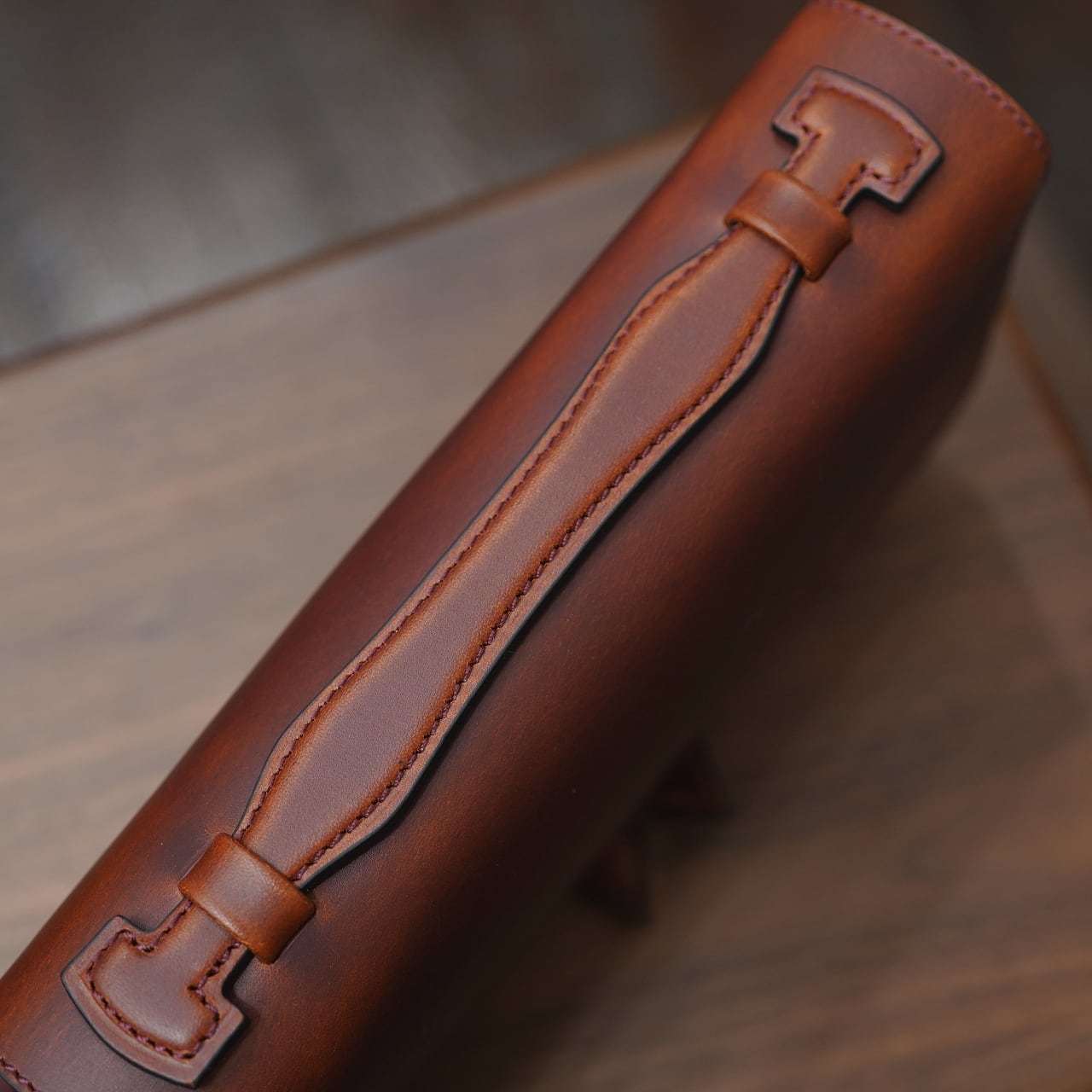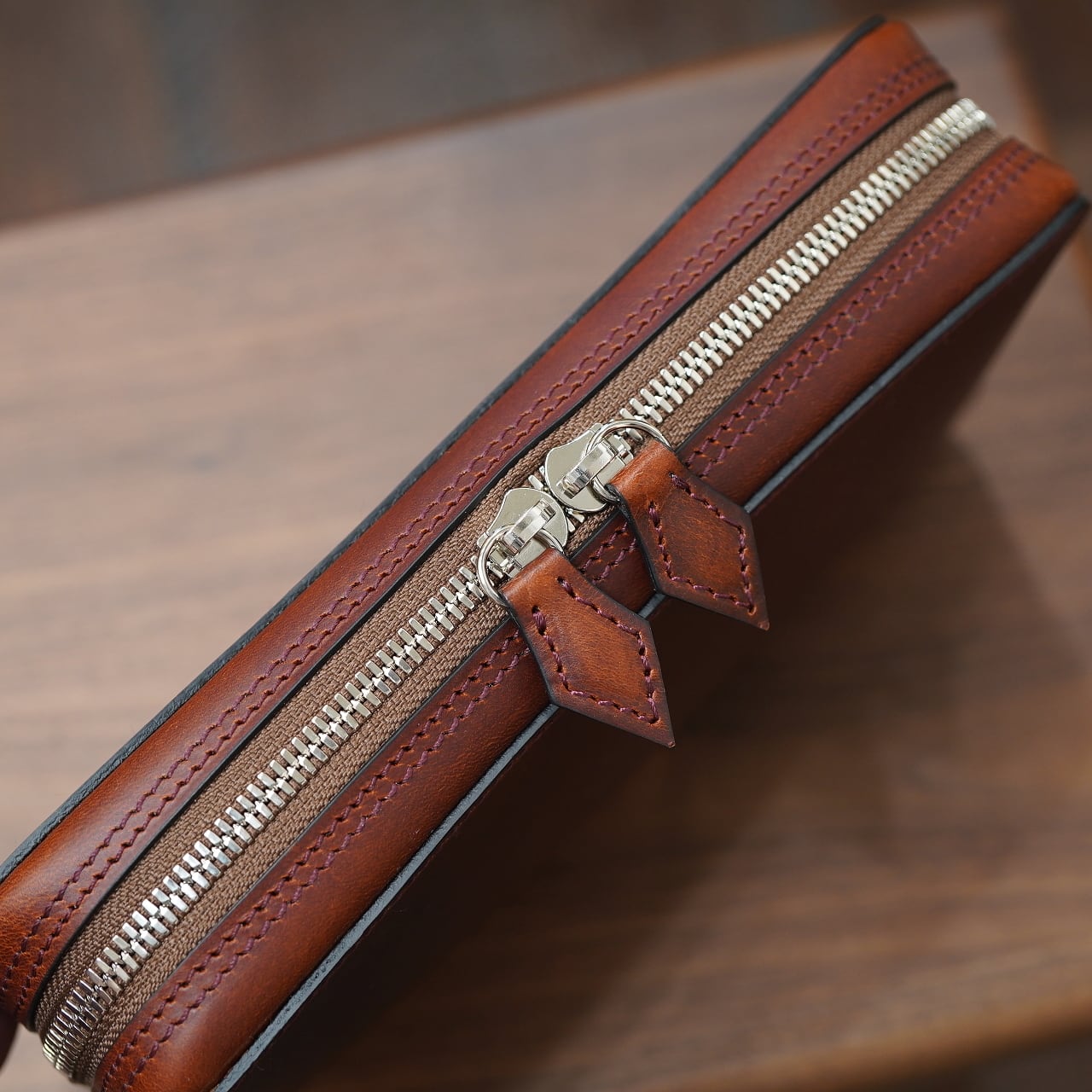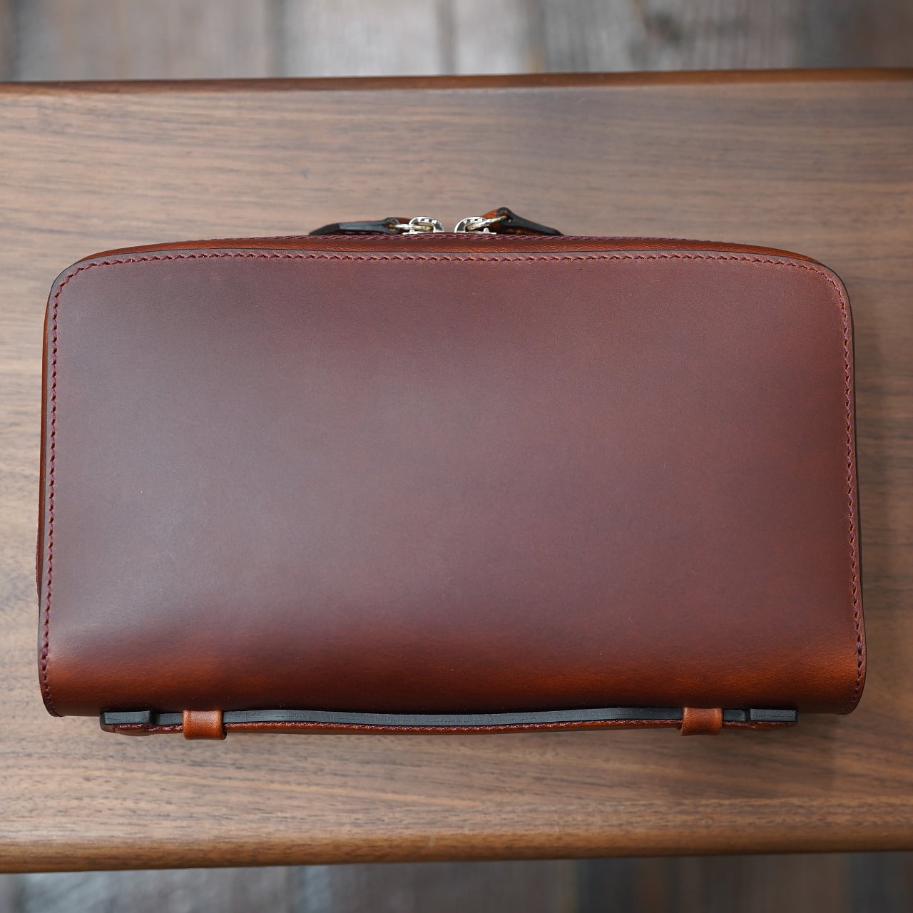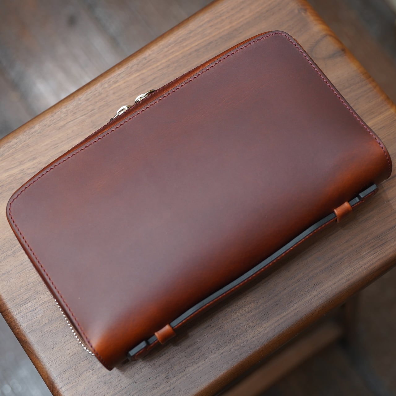 発色豊かでエイジングがとても美しく、適度に良いハリ感のあるブッテーロをベースに、そこに通常の倍ほどのオイルをしっかり入れることで、よりオイリーかつ色の深い仕上がりになったバージョン。これがまた面白く、ポーチにもぴったりで、シックでスタイリッシュな風合いでお使い頂けます。