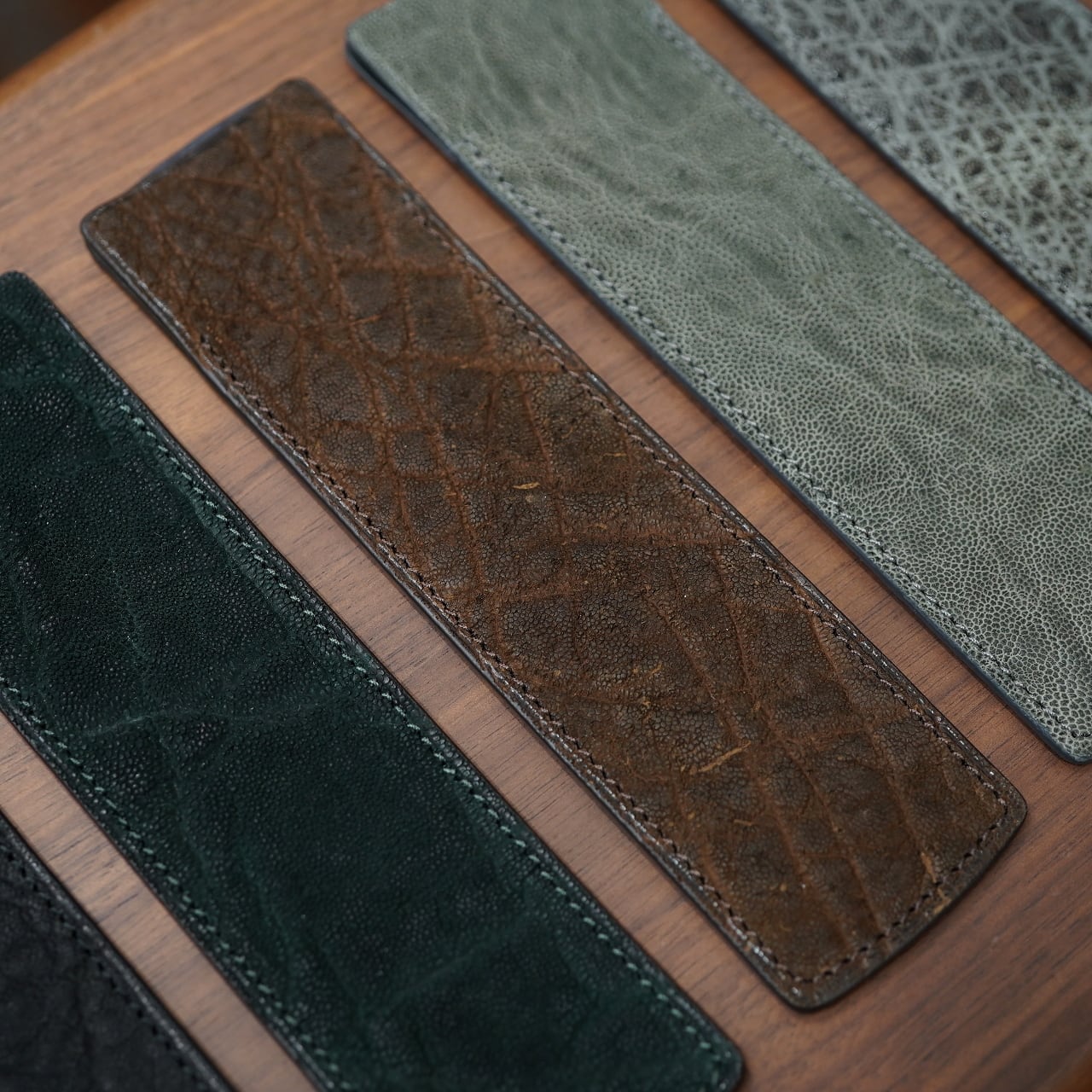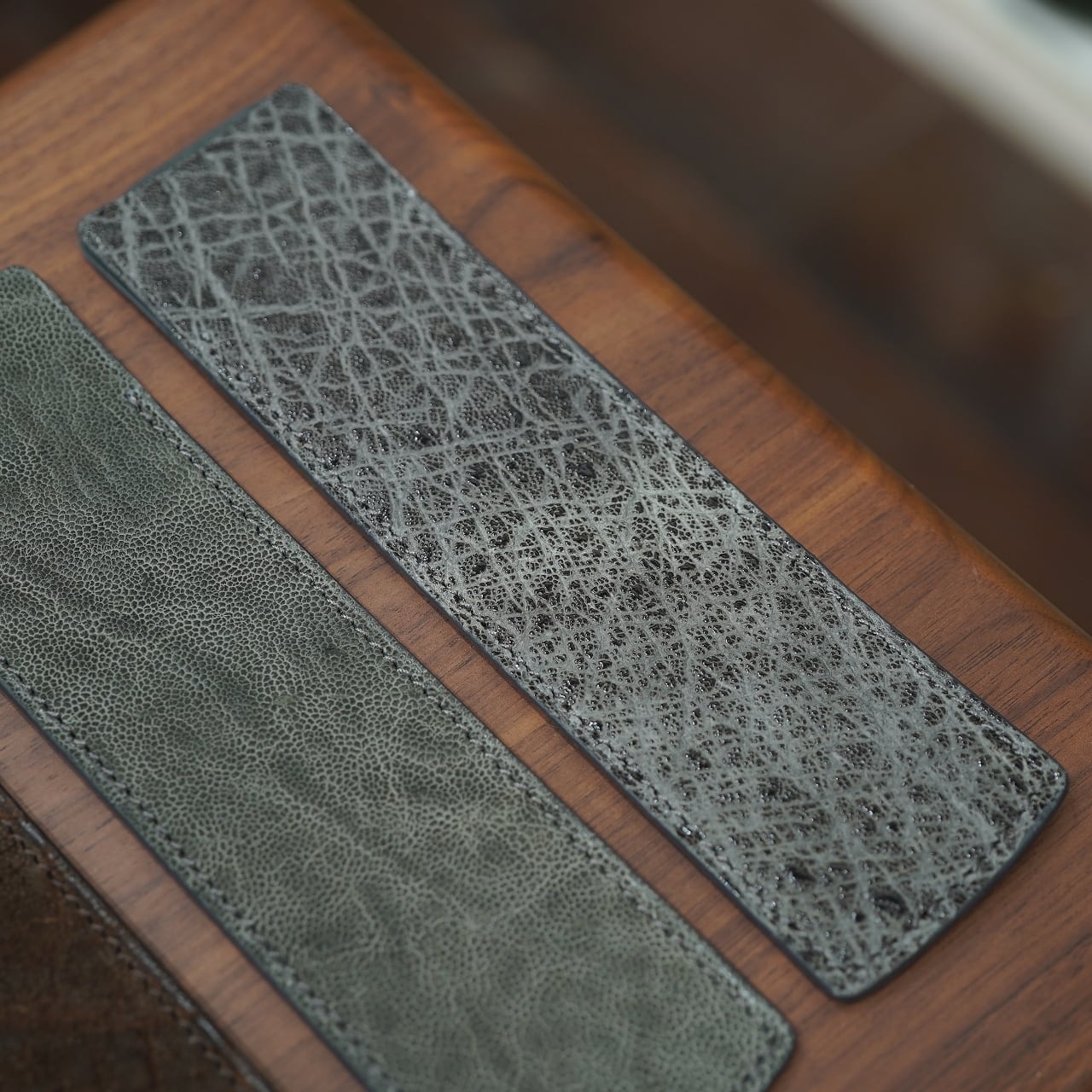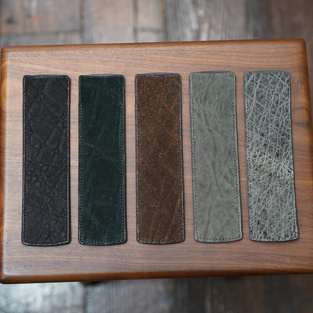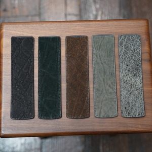 外側のメイン素材にはエレファントレザーにて、ブラック、ダークグリーン、ダークブラウン、グレー、漆仕上げグレーの5パターン。