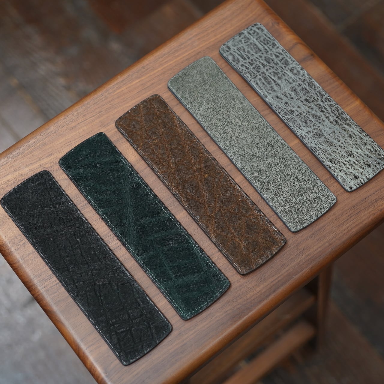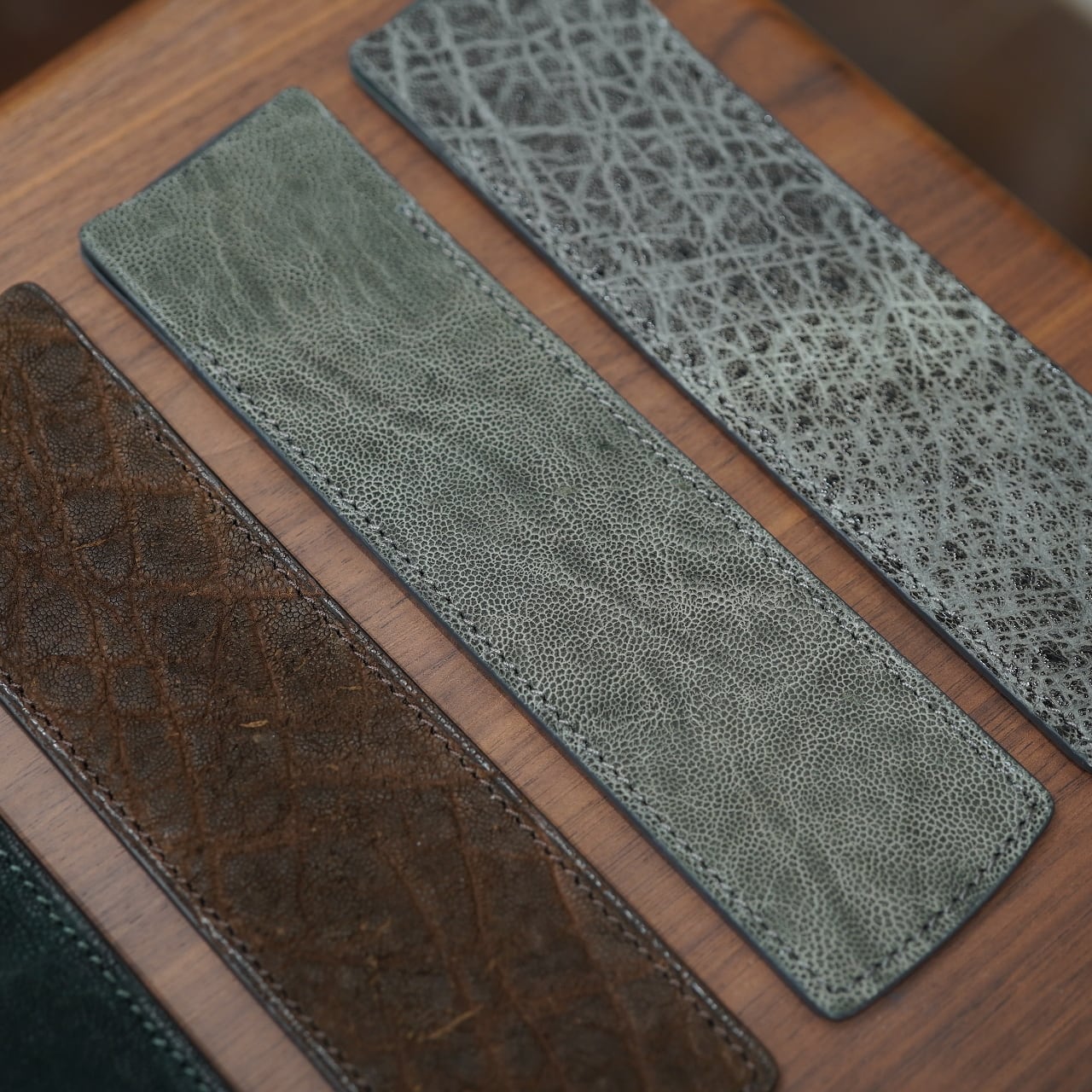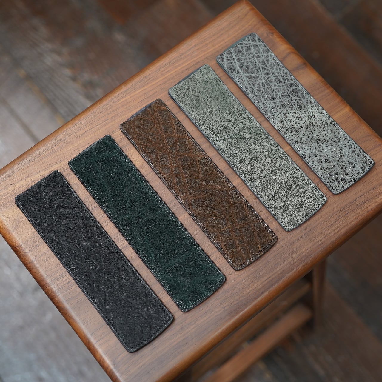 外側のメイン素材にはエレファントレザーにて、ブラック、ダークグリーン、ダークブラウン、グレー、漆仕上げグレーの5パターン。