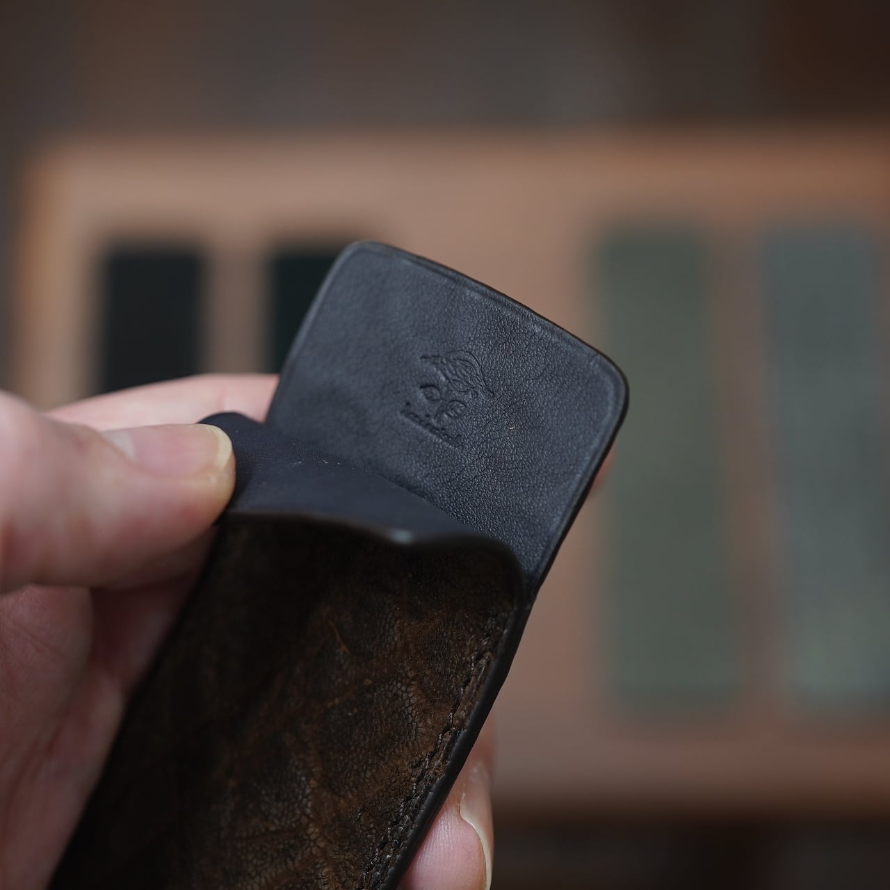 また、ステッチやコバのあたりの革は少し薄くして全体を薄型に、けれどボディの部分は端より少しだけ厚くすることで、「薄いけれどもふっくらとした革の質感の良さは感じられる」つくりになっています。