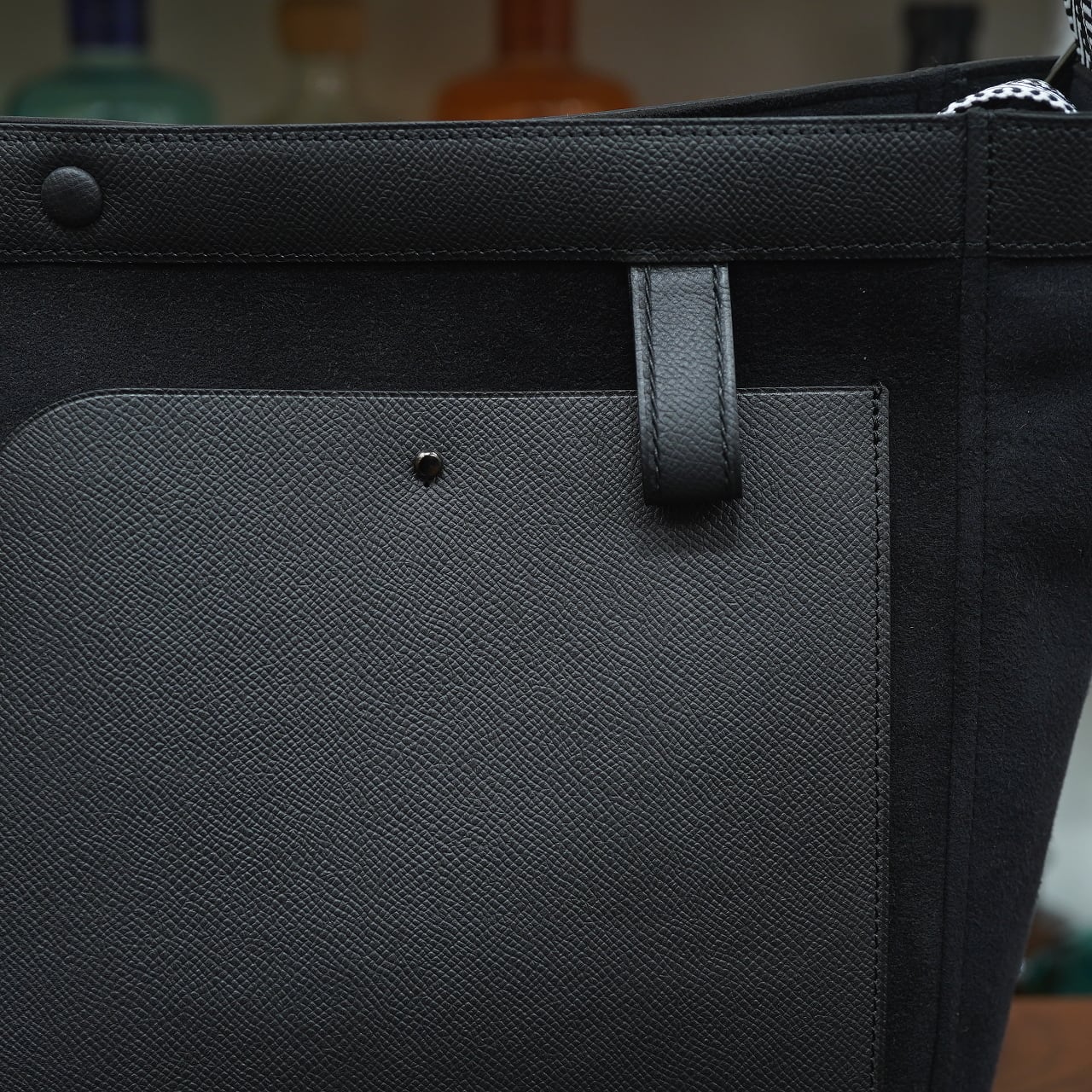 そこにアクセントとして口元やポケットにはやはり風合い豊かな海外皮革をたっぷり合わせることで、カジュアルながらもラグジュアリーさのあるショルダーバッグに仕上がってくれています。