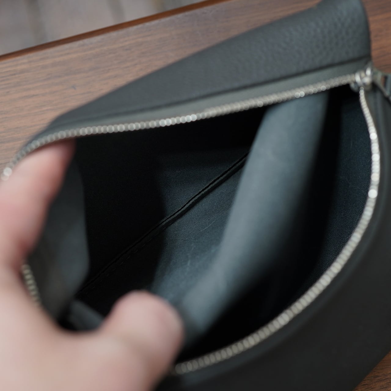 半分に折られた見た目と全体のサイズ感に対して、実はフラップに見える側も収納部屋になっているため、地味に色々とたっぷり入れられて便利なかたち。