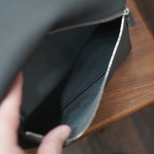 二つ折りになったデザインはまるでフラップ式で開くポーチに見えますが、実は違って収納は裏面外側にファスナーがついています。