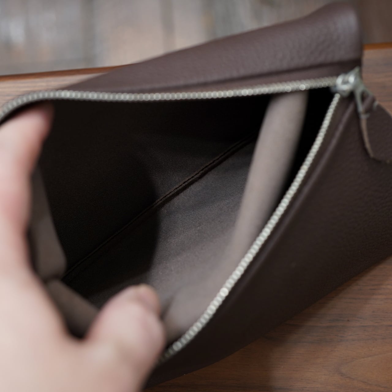シボ感が上品で美しく、発色も豊かで綺麗で、革も密度がしっかり高くありながら、しなやかで柔らかく、それでいてもっちりと弾力感がある、やはり心地よい皮革。