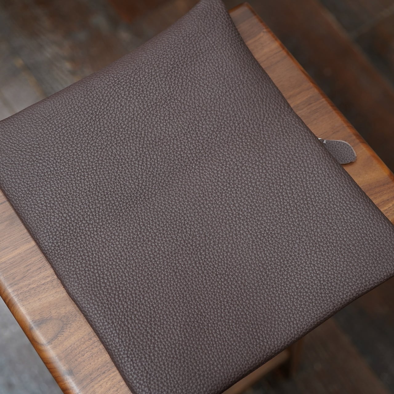 もちろん床面の感触も心地よく、また芯通しの革ゆえに色合いも美しく、dumiポーチにもやはりぴったりの雰囲気になってくれました。