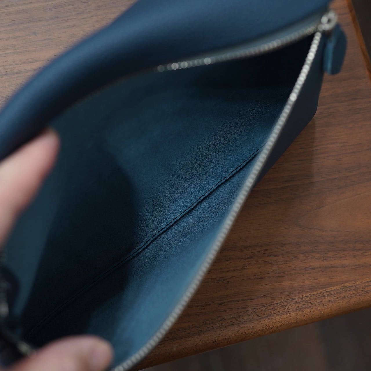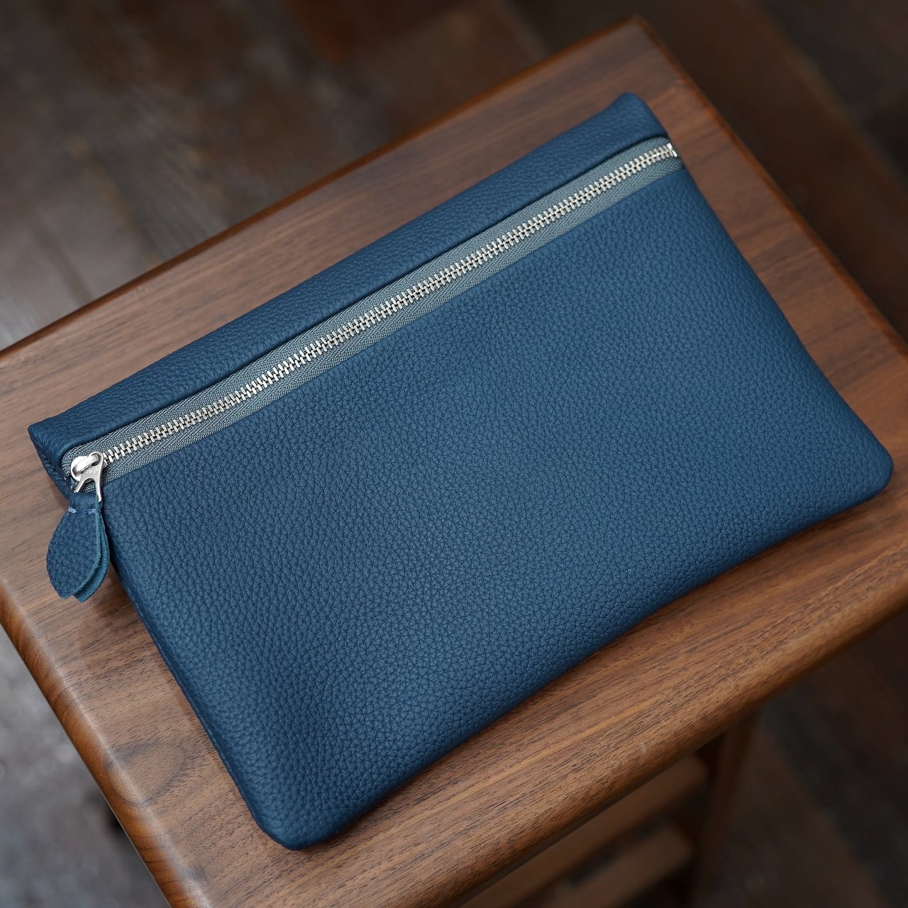 もちろん床面の感触も心地よく、また芯通しの革ゆえに色合いも美しく、dumiポーチにもやはりぴったりの雰囲気になってくれました。