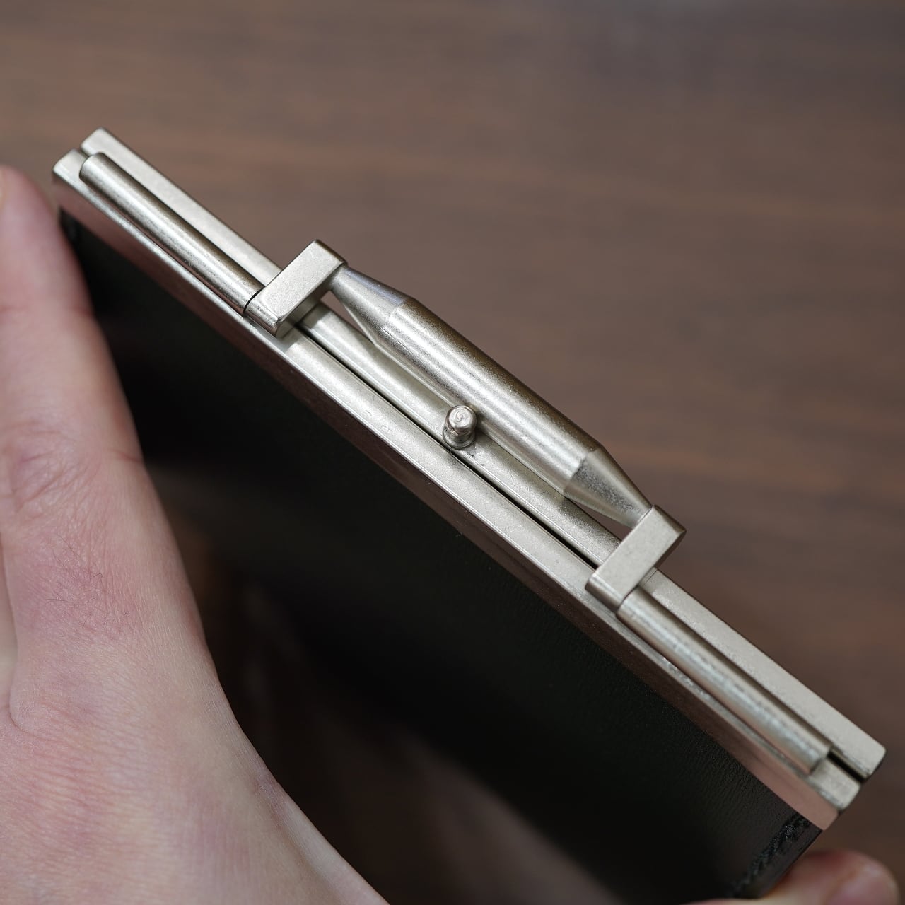 メゾンドアルチザン独自の形を起こしてもらっており、CIRCLEと細かな部分をやりとりしながら、非常にスタイリッシュかつがっしり感もほどよい、美しいがま口金具に。