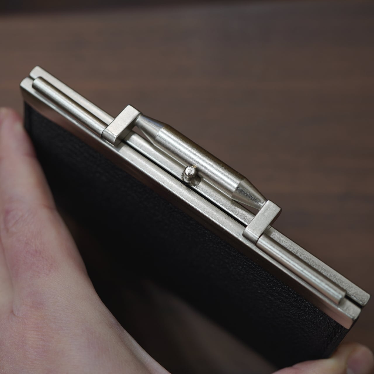メゾンドアルチザン独自の形を起こしてもらっており、CIRCLEと細かな部分をやりとりしながら、非常にスタイリッシュかつがっしり感もほどよい、美しいがま口金具に。