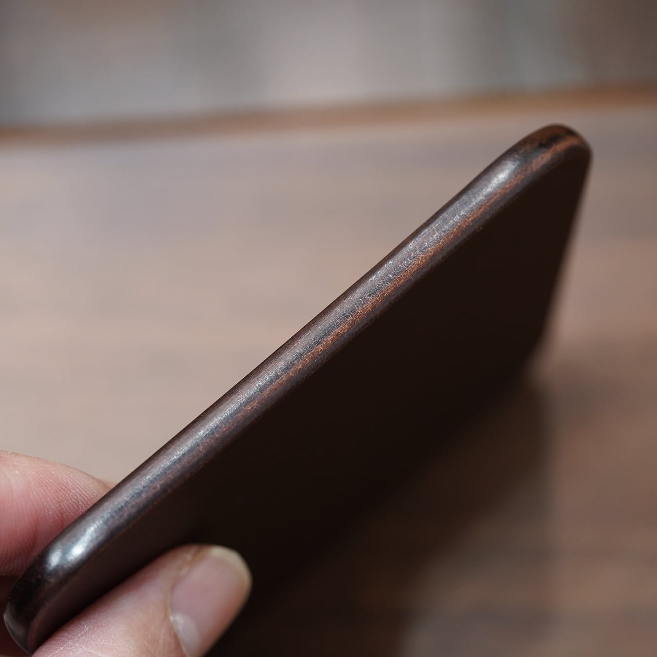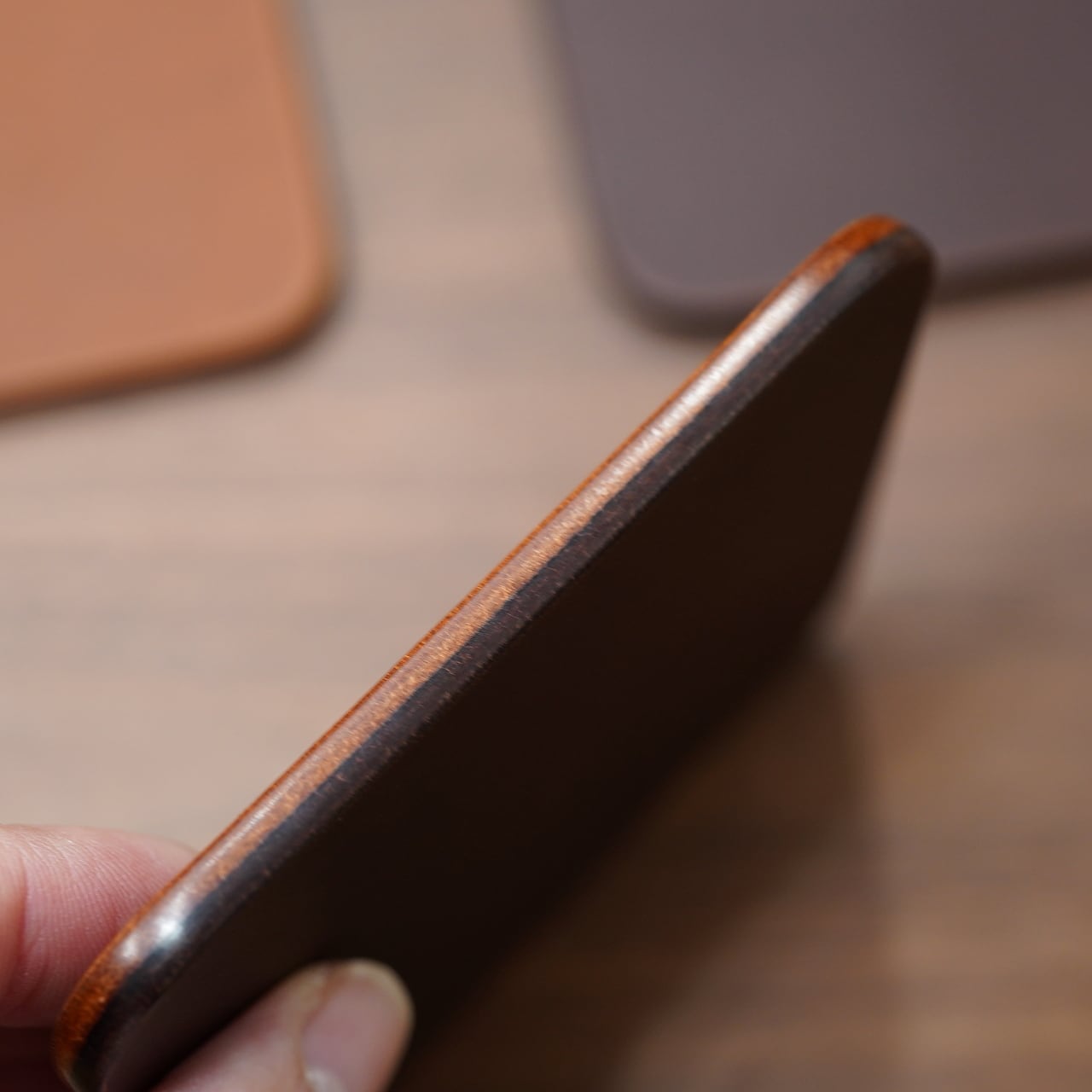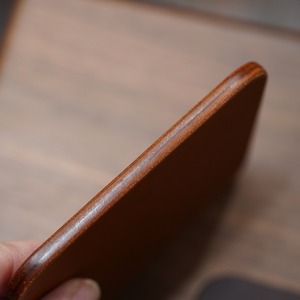 あえてコバ染料は入れずに、摩擦で深く色づいた色合いや風合いが美しいコバに。