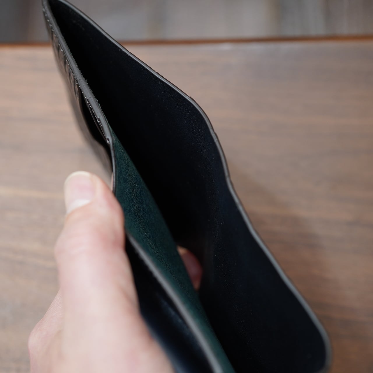 初めは革のハリがあるのでボディ全体がふっくらとして、やや開く感じがありますが、使っているうちにすぐに全体の革は馴染み、ペタンと自然と閉じ、薄く感じるようになります。