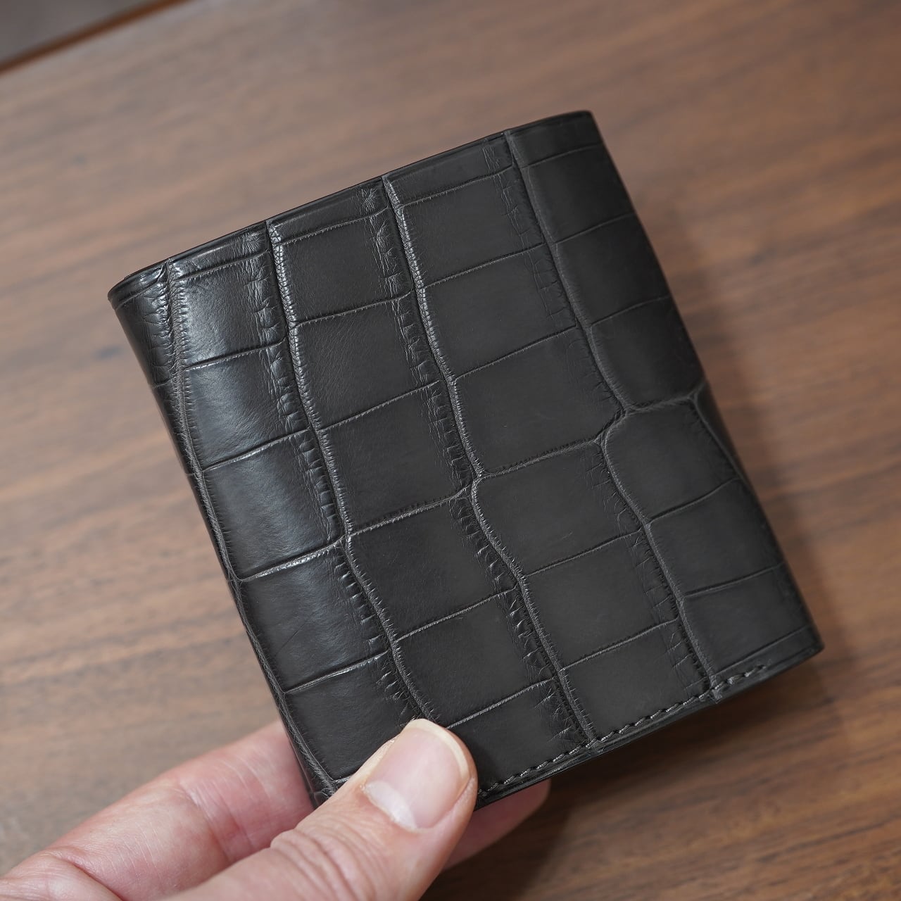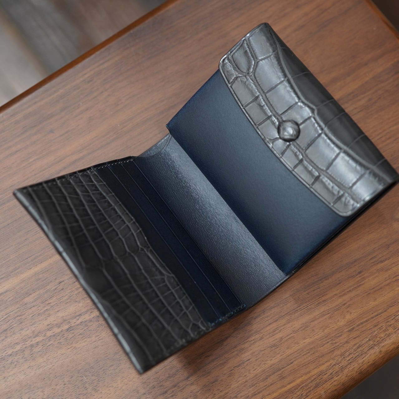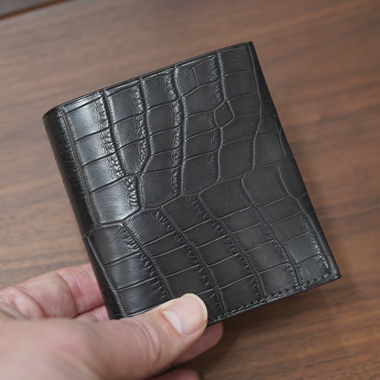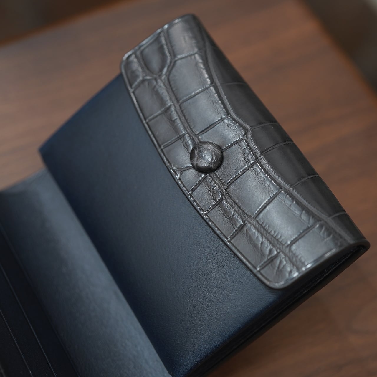 こちらはCIRCLEの12周年記念企画として、カンダミサコブランドの作るシンプルでありつつカンダミサコらしい工夫と作りの美しさが備わった、小銭入れ付き二つ折り財布を普段作っていない特別なクロコダイルレザーバージョンで、しかも超贅沢裁断で仕上げてもらいました。!