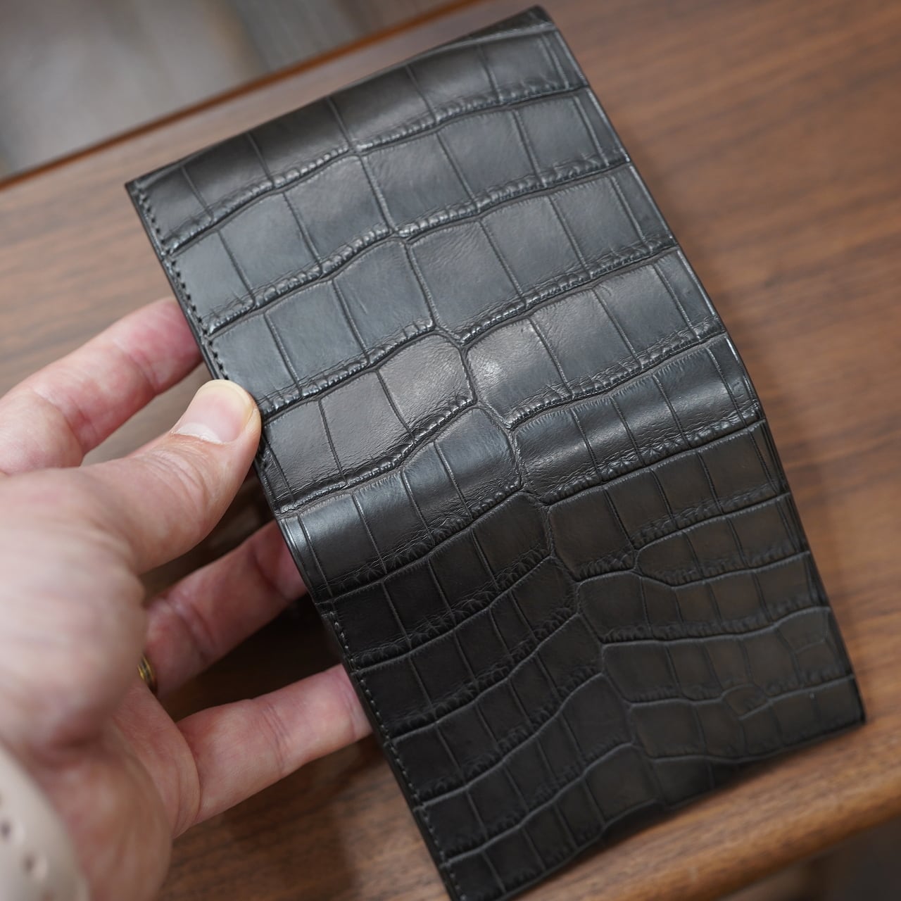 それをあえて二つ折りにちょうど良いサイズのクロコを集め、革のど真ん中センターを思い切って一つずつだけ贅沢に裁断して用いてもらいました。
