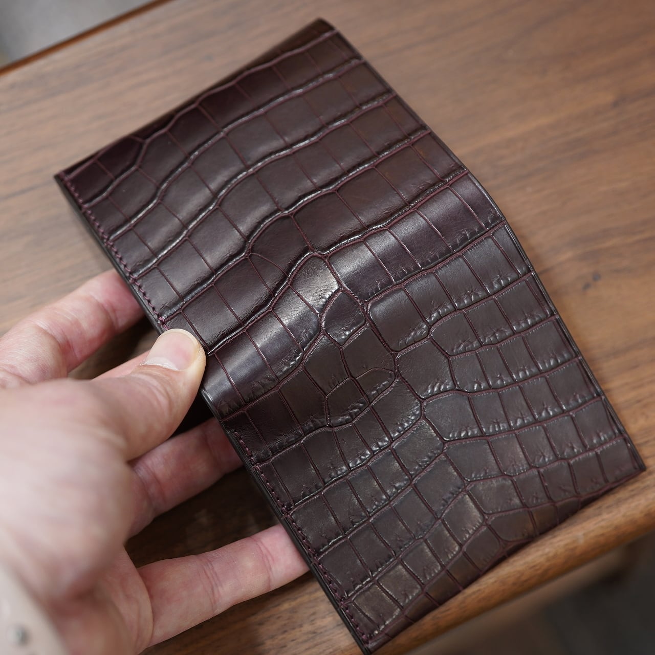 もう少し大きいサイズのクロコにして、二つ折りならセンターではなく二つ分裁断して……とする方がおそらく一般的でしょうし、コストも抑えられるでしょうけれど。