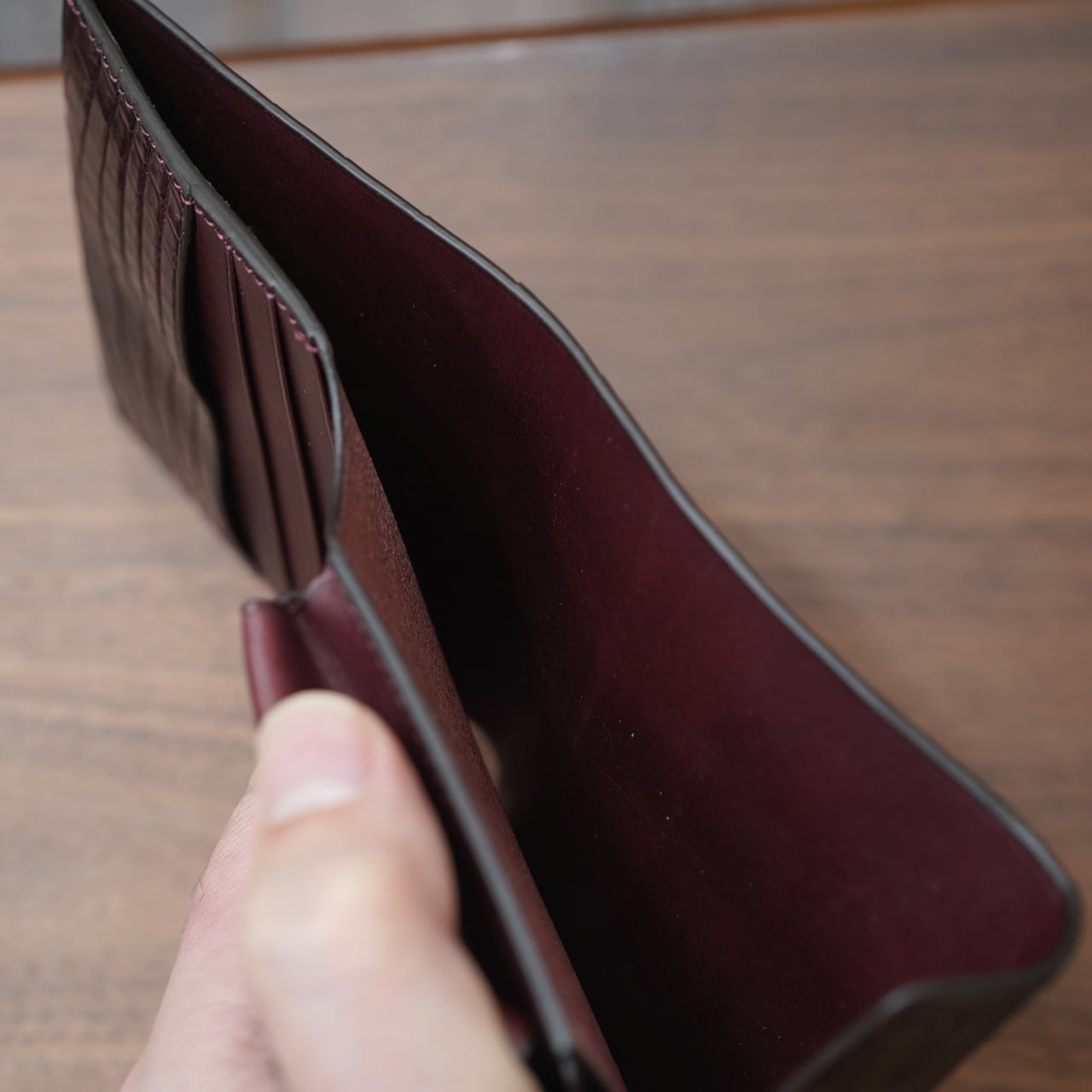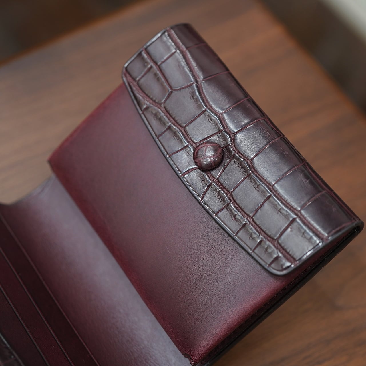 クロコダイルとブッテーロ、おもてと中面それぞれででエイジングをぐっとお愉しみいただきながら、利便性も非常に高い二つ折り財布になっています。