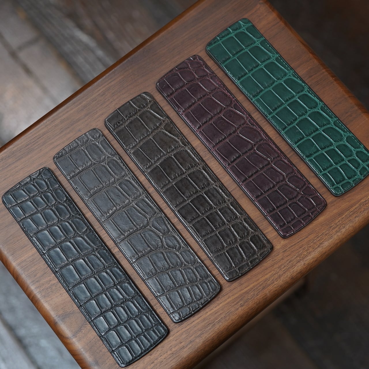 外側のメイン素材にはクロコダイルレザーにて、ブラック、チャコールグレー 、シガーブラウン、ボルドー、グリーンの5パターン。