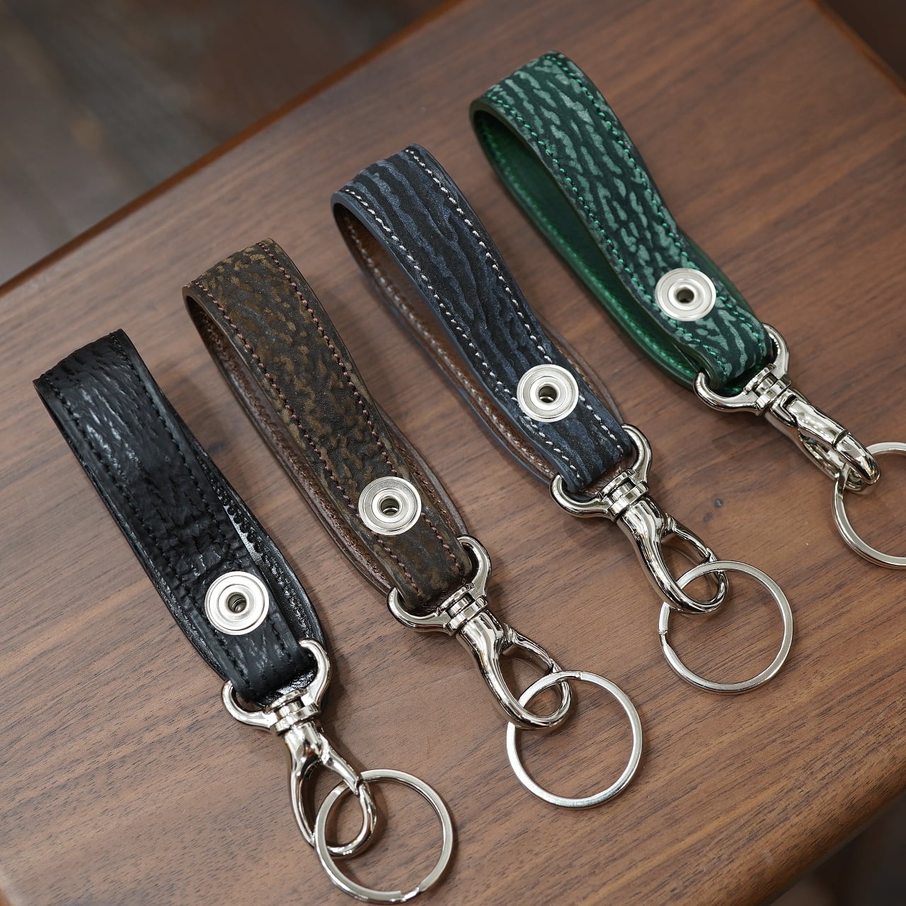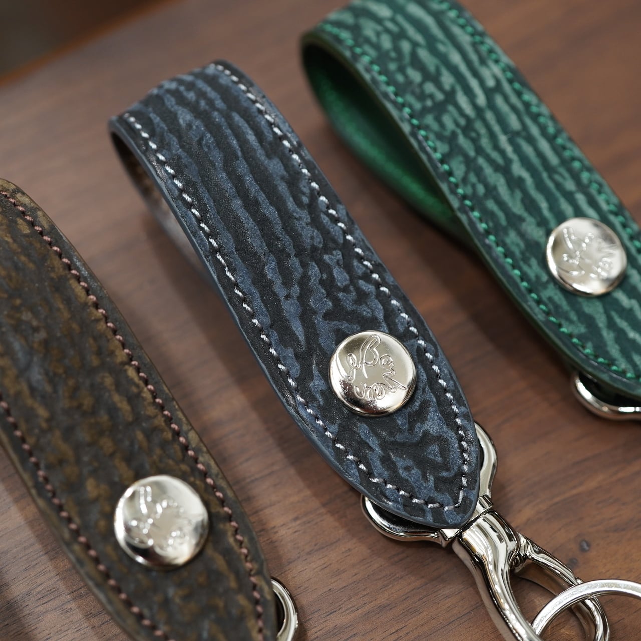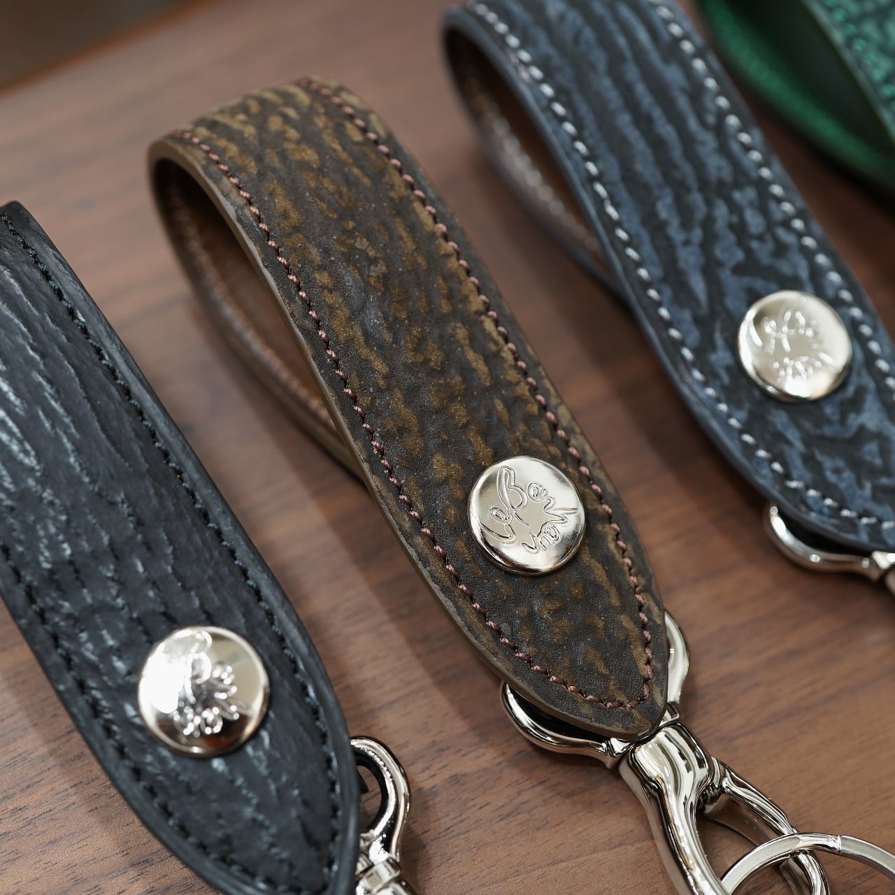 今回はCIRCLEの希望にて、ボナーさんのベルトキーホルダーでは滅多に作られることのない、様々な皮革でお願いしました!
