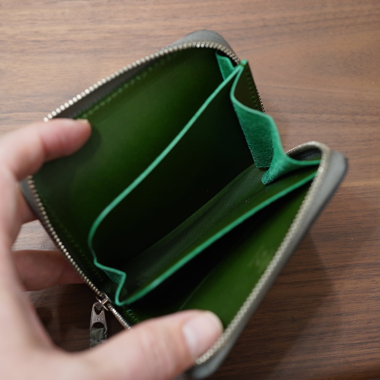 一般的なコンパクト財布に比べて、ラウンドファスナー財布的なフォルムの安定感と、シンプルながら特徴的な構造でしっかり収納力が高く、また軽やかなお財布に仕上がっています。