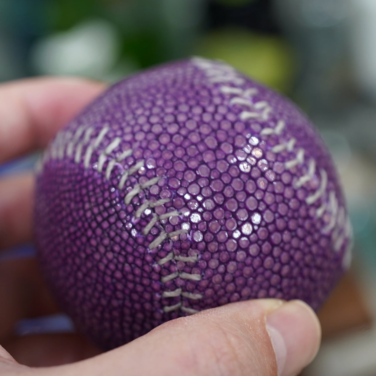 それをベースとして、上にガルーシャレザーを贅沢にあしらい、しっかり野球ボールらしいステッチで、手縫いで縫い上げて仕上げられました。
