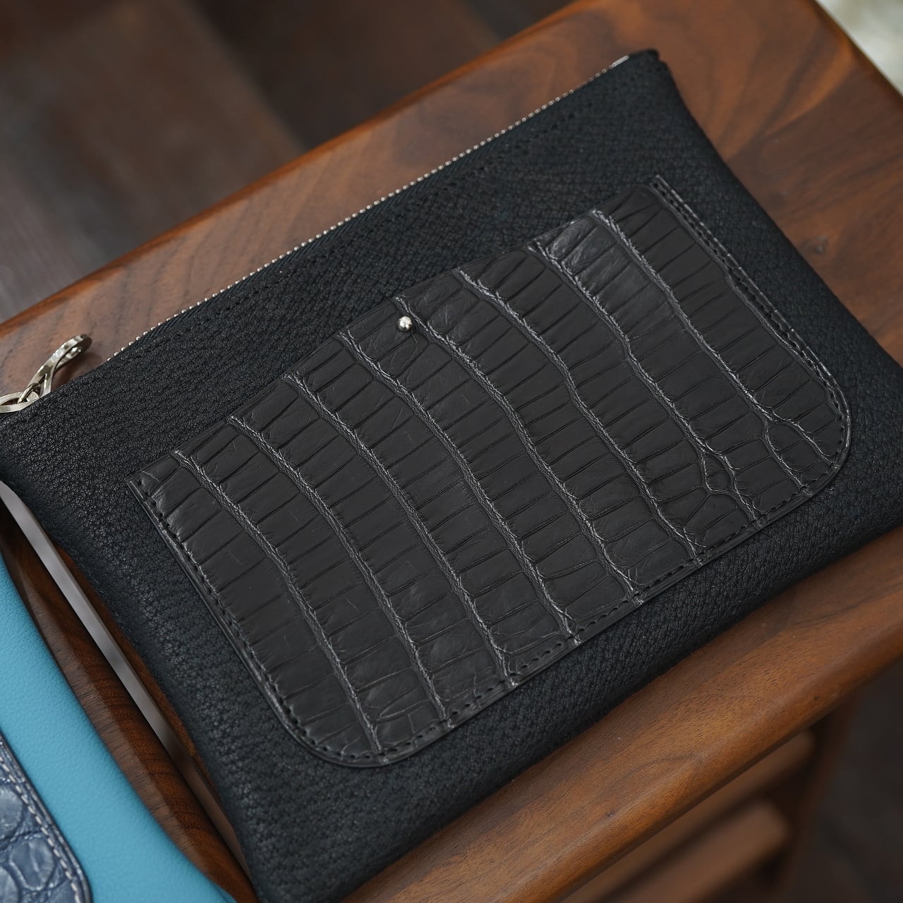 そのポケットをまさかの本物のがっしりクロコダイルレザーを、しかも割と良い斑のところを贅沢にあしらっています。