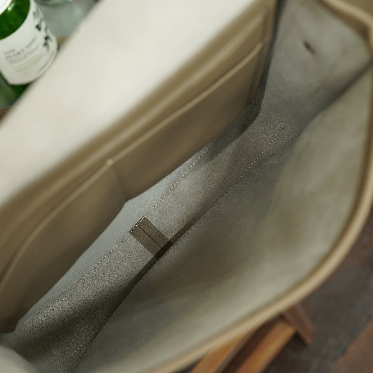 シュランケンカーフの素材を存分に活かすために、あえて裏地はもうけずに床面をそのまま出し、メイン部分などは革も原厚で用いることで、もっちりとしたシュランケンカーフ特有の質感を全体で味わえる仕様です。
