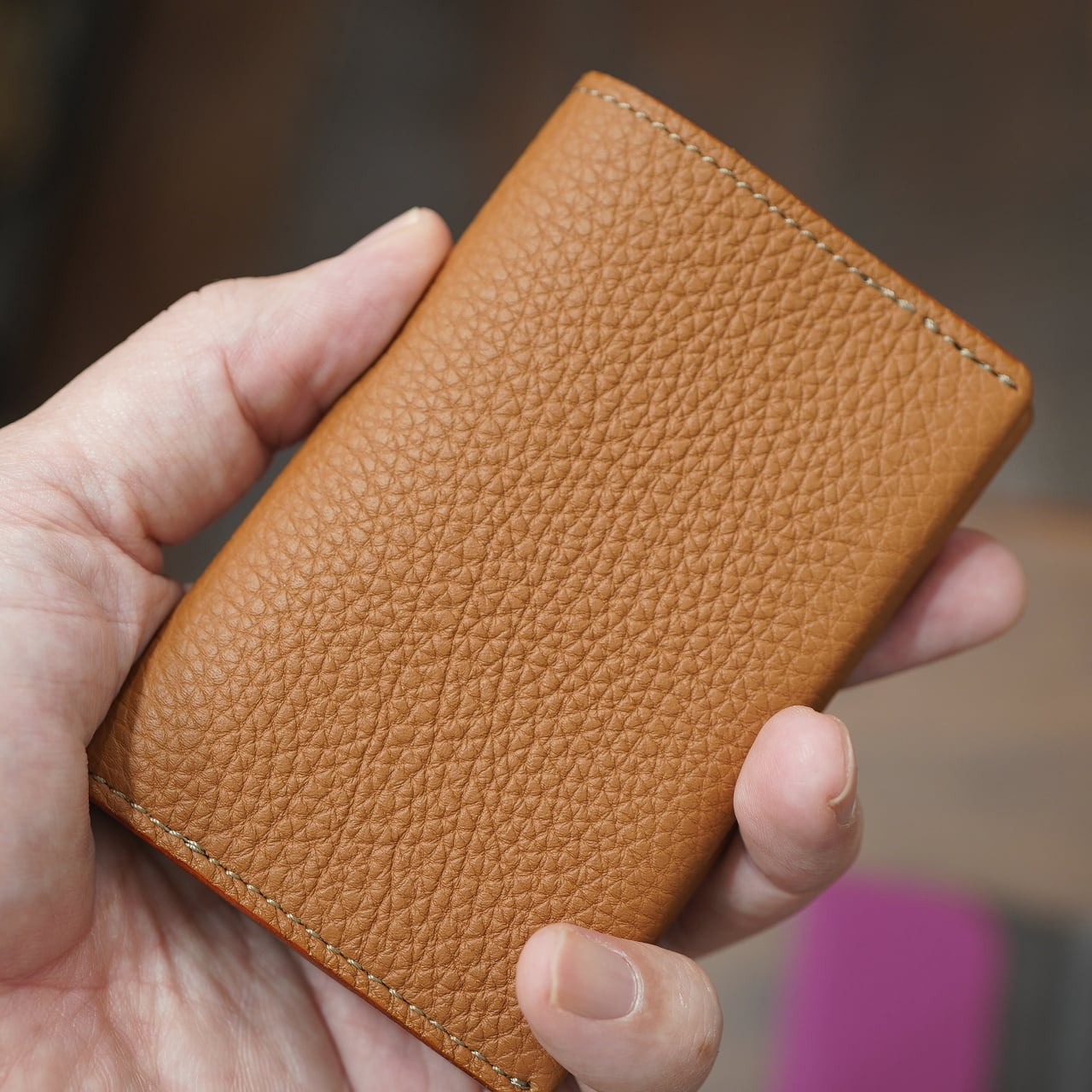 シンプルでありながら、しっかり革の豊かな風合いと、コンパクトながらしっかり良い収納力や機能性を持ったケースに仕上がっています。