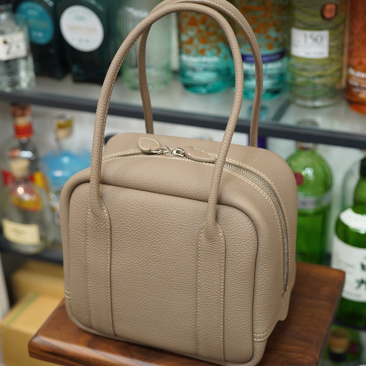 上質な海外皮革を始め、様々な革を厳選して使用し、ふっくらと味わい深く洗練されたバッグや、お財布などを生み出している神戸の革ブランド、ル・ボナーのコロンと四角いフォルムが可愛いハンドバッグ、コンフェッティです。