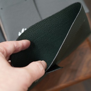 できるだけ薄く漉いた革を2枚圧着して貼り合わせることにより、薄く軽いながらも驚くほど丈夫にできています。