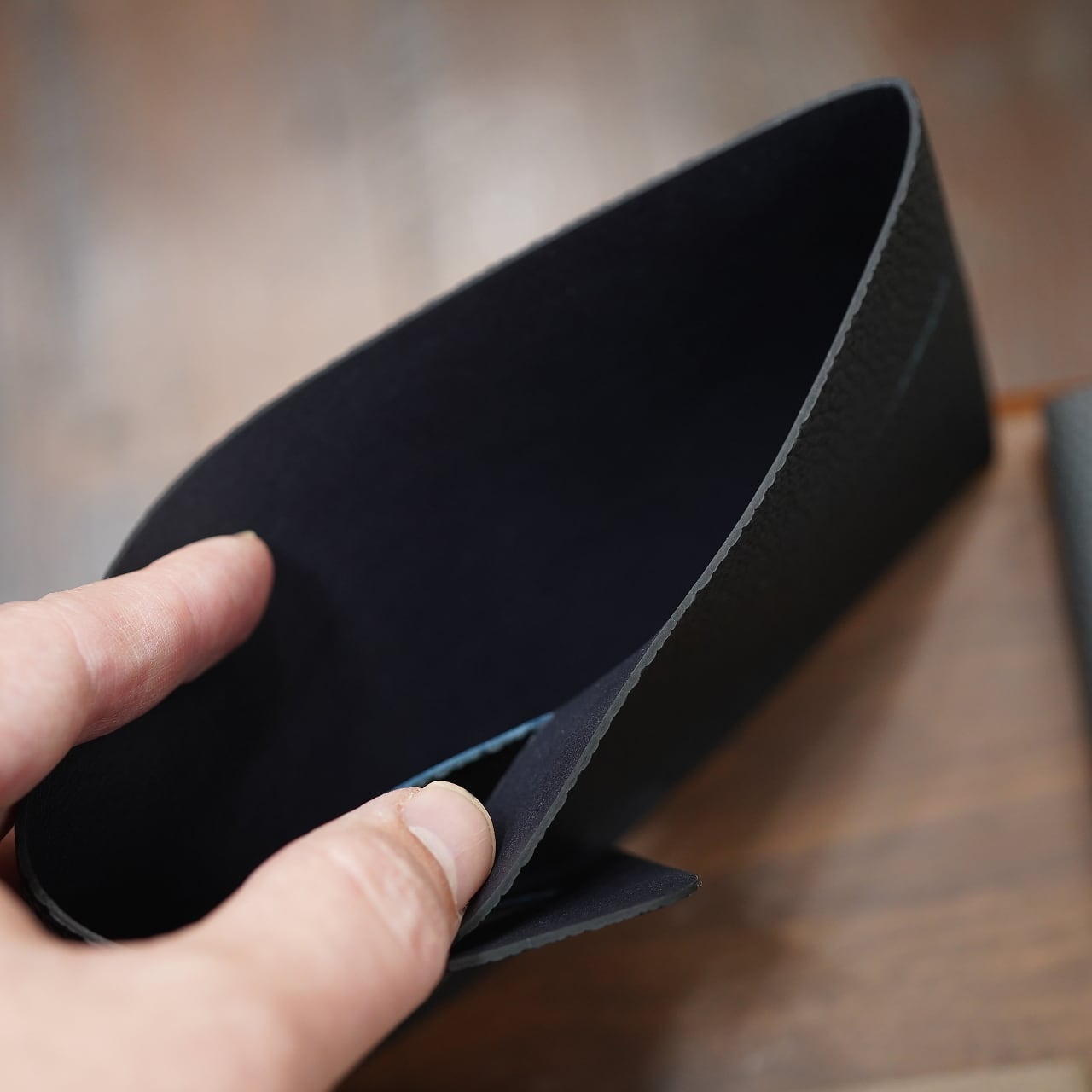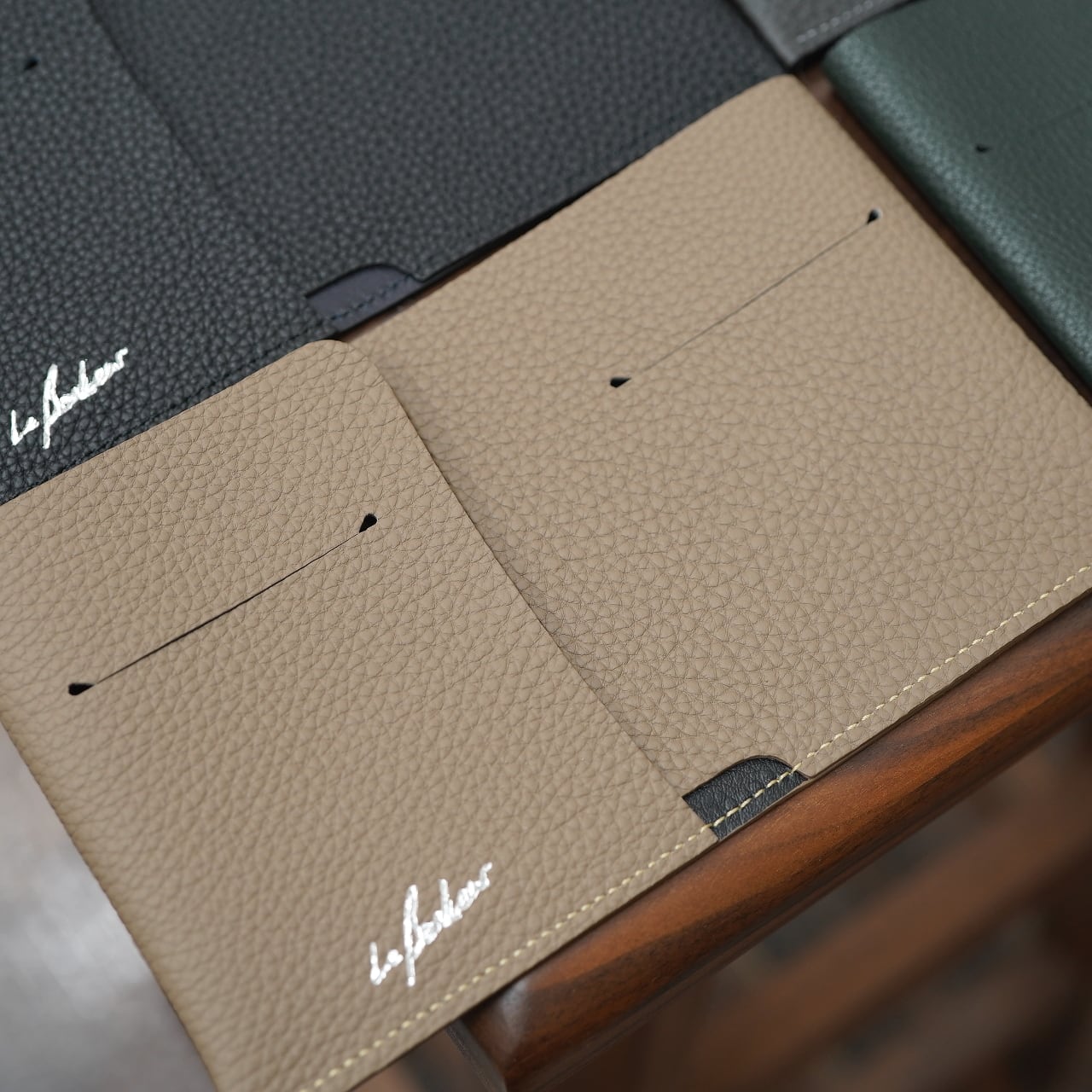 内装はカラーによって異なり、ブラック、アントラジス、トープにはボナーさんオリジナル革のデンマークソフトカーフを、ダークグリーンには表と同様にシュランケンカーフを合わせて用いて、非常に高級感のある純札入れです。