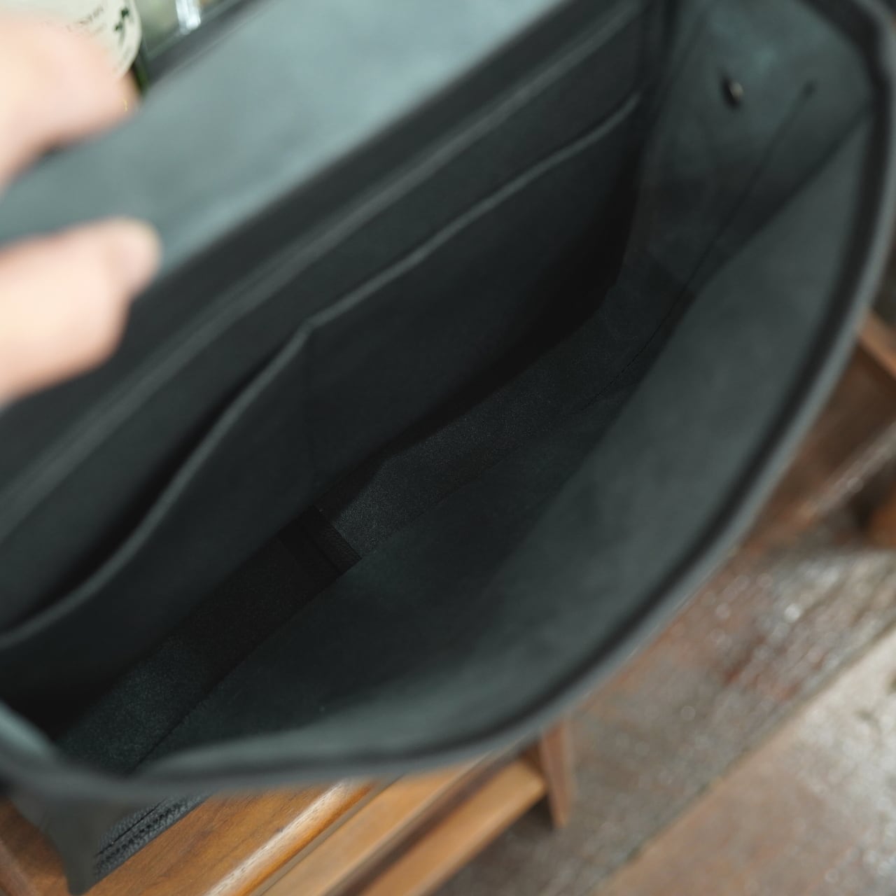 大きなフラップを開けると、中は非常にシンプル。広い1部屋にフリーポケットが2室、それとファスナーポケットが1つ。