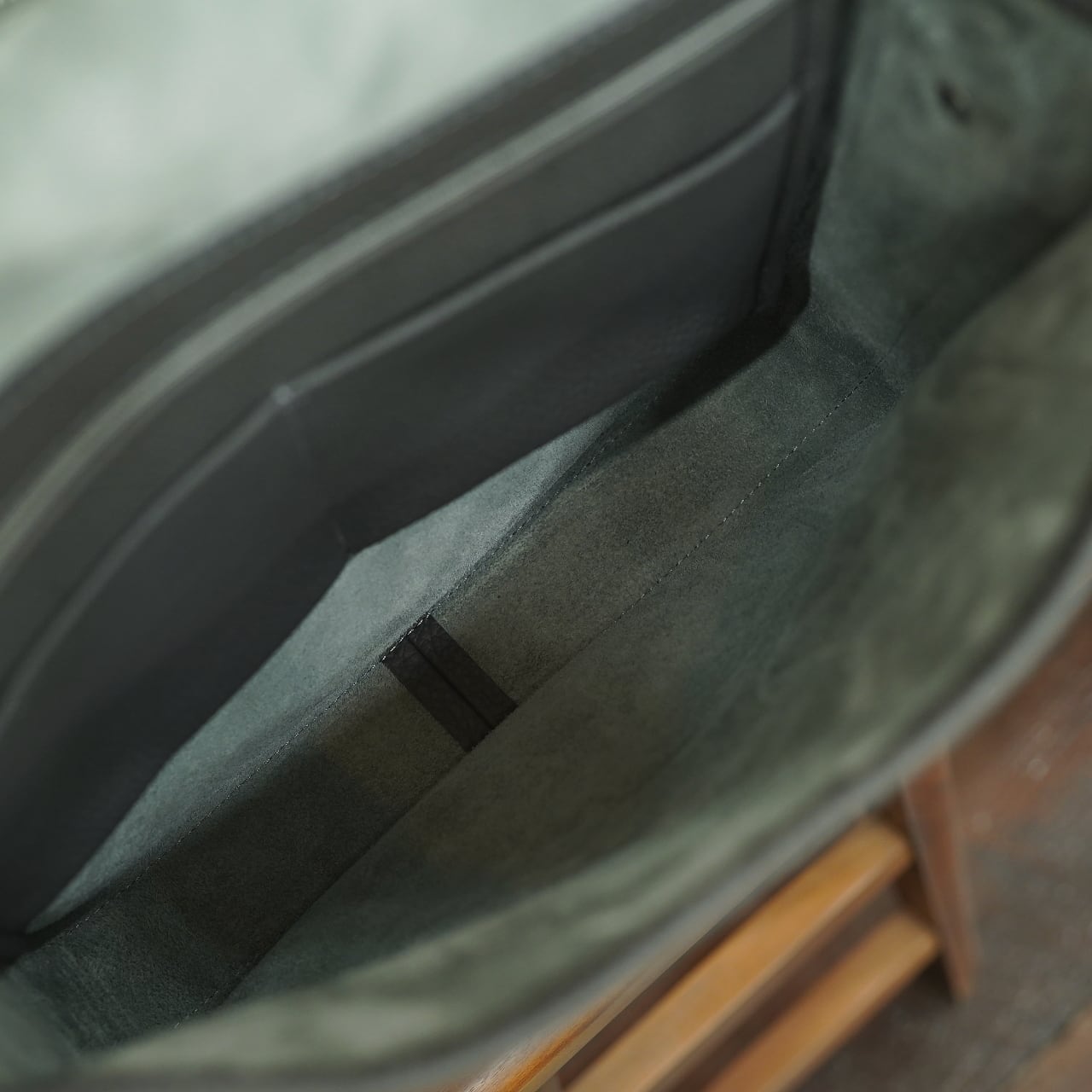 シュランケンカーフの素材を存分に活かすために、あえて裏地はもうけずに床面をそのまま出し、メイン部分などは革も原厚で用いることで、もっちりとしたシュランケンカーフ特有の質感を全体で味わえる仕様です。