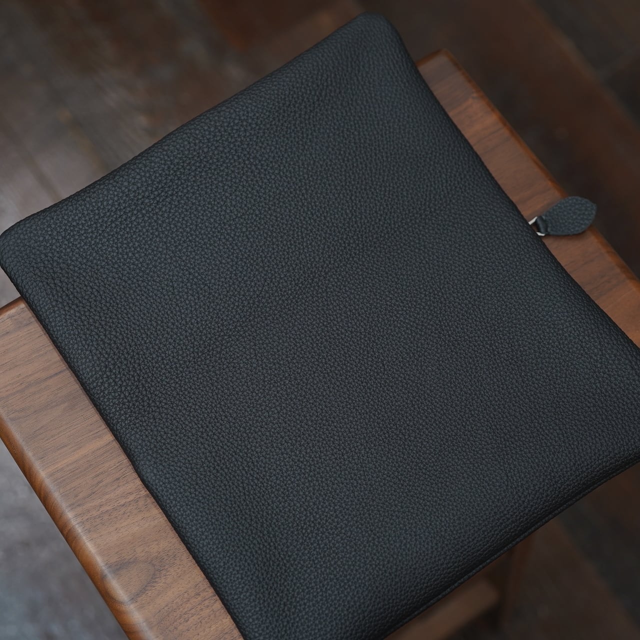 もちろん床面の感触も心地よく、また芯通しの革ゆえに色合いも美しく、dumiポーチにもやはりぴったりの雰囲気になってくれました。